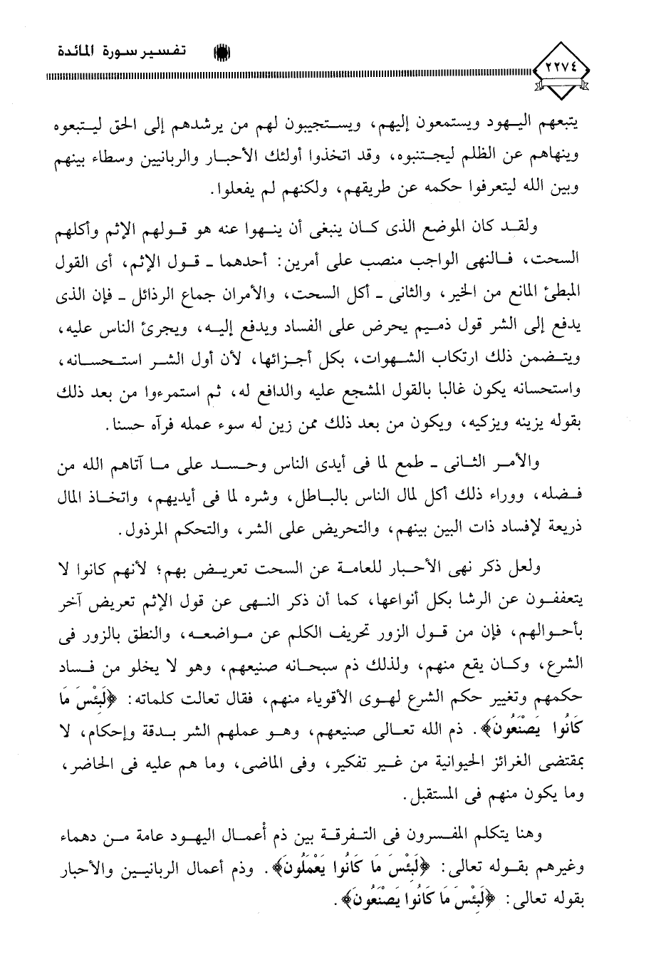 ولعل ذكر نهي الأحبار للعامة عن السحت تعريض بهم، لأنهم كانوا لا يتعففون عن الرشا بكل أنواعها، كما أن ذكر النهي عن قول الإثم تعريض آخر بأحوالهم، فإن من قول الزور تحريف الكلم عن مواضعه، والنطق بالزور في الشرع، وكان يقع منهم، ولذلك ذم سبحانه صنيعهم، وهو لَا يخلو من فساد حكمهم وتغيير حكم الشرع لهوى الأقوياء منهم، فقال تعالت كلماته: (لَبِئْسَ مَا كَانُوا يَعْمَلُونَ). ذم الله تعالى صنيعهم، وهو عملهم الشر بدقة وإحكام، لا بمقتضى الغرائز الحيوانية من غير تفكير، وفي الماضي، وما هم عليه في الحاضر، وما يكون منهم في المستقبل.