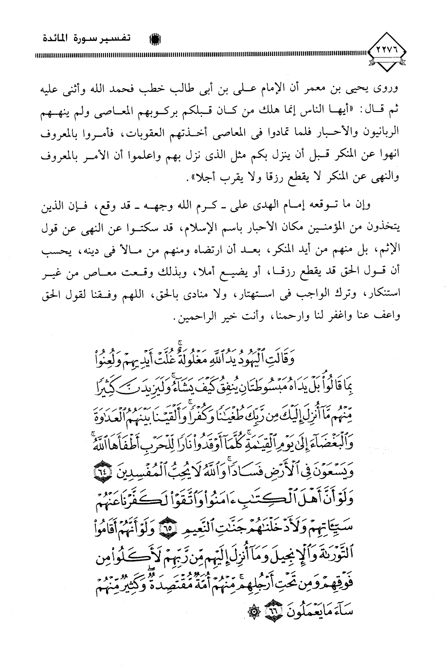 (وَقَالَتِ الْيَهُودُ يَدُ اللَّهِ مَغْلُولَةٌ غُلَّتْ أَيْدِيهِمْ وَلُعِنُوا بِمَا قَالُوا بَلْ يَدَاهُ مَبْسُوطَتَانِ يُنْفِقُ كَيْفَ يَشَاءُ وَلَيَزِيدَنَّ كَثِيرًا مِنْهُمْ مَا أُنْزِلَ إِلَيْكَ مِنْ رَبِّكَ طُغْيَانًا وَكُفْرًا وَأَلْقَيْنَا بَيْنَهُمُ الْعَدَاوَةَ وَالْبَغْضَاءَ إِلَى يَوْمِ الْقِيَامَةِ كُلَّمَا أَوْقَدُوا نَارًا لِلْحَرْبِ أَطْفَأَهَا اللَّهُ وَيَسْعَوْنَ فِي الْأَرْضِ فَسَادًا وَاللَّهُ لَا يُحِبُّ الْمُفْسِدِينَ (64) وَلَوْ أَنَّ أَهْلَ الْكِتَابِ آمَنُوا وَاتَّقَوْا لَكَفَّرْنَا عَنْهُمْ سَيِّئَاتِهِمْ وَلَأَدْخَلْنَاهُمْ جَنَّاتِ النَّعِيمِ (65) وَلَوْ أَنَّهُمْ أَقَامُوا التَّوْرَاةَ وَالْإِنْجِيلَ وَمَا أُنْزِلَ إِلَيْهِمْ مِنْ رَبِّهِمْ لَأَكَلُوا مِنْ فَوْقِهِمْ وَمِنْ تَحْتِ أَرْجُلِهِمْ مِنْهُمْ أُمَّةٌ مُقْتَصِدَةٌ وَكَثِيرٌ مِنْهُمْ سَاءَ مَا يَعْمَلُونَ (66)