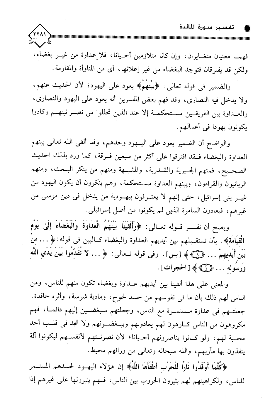 والواضح أن الضمير يعود على اليهود وحدهم، وقد ألقى الله تعالى بينهم العداوة والبغضاء فقد افترقوا على أكثر من سبعين فرقة، كما ورد بذلك الحديث الصحيح، فمنهم الجبرية والقدرية، والشبهة ومنهم من ينكر البعث، ومنهم الربانيون والقراءون، وبينهم العداوة مستحكمة، وهم ينكرون أن يكون اليهود من غير بني إسرائيل، حتى إنهم لَا يعترفون بيهودية من يدخل في دين موسى من غيرهم، فيعادون السامرة الذين لم يكونوا من أصل إسرائيلي.