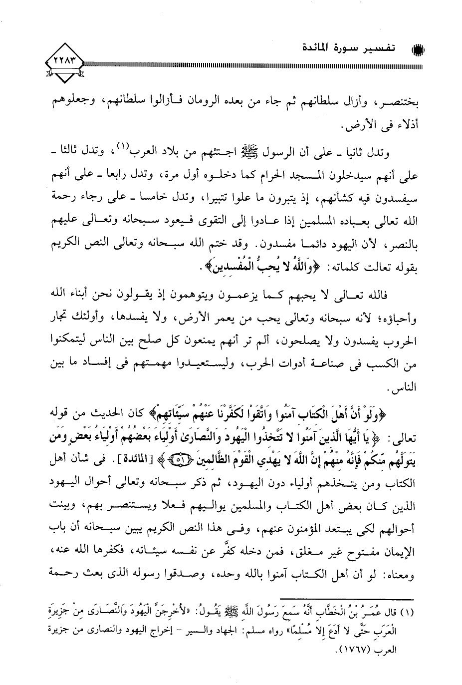 وتدل ثانيا - على أن الرسول - صلى الله عليه وسلم - اجتثهم من بلاد العرب (¬1)، وتدل ثالثا - على أنهم سيدخلون المسجد الحرام كما دخلوه أول مرة، وتدل رابعا - على أنهم سيفسدون فيه كشأنهم، إذ يتبرون ما علوا تتبيرا، وتدل خامسا - على رجاء رحمة الله تعالى بعباده المسلمين إذا عادوا إلى التقوى فيعود سبحانه وتعالى عليهم بالنصر، لأن اليهود دائما مفسدون. وقد ختم الله سبحانه وتعالى النص الكريم بقوله تعالت كلماته: (وَاللَّهُ لَا يُحِبُّ الْمُفْسِدِين).