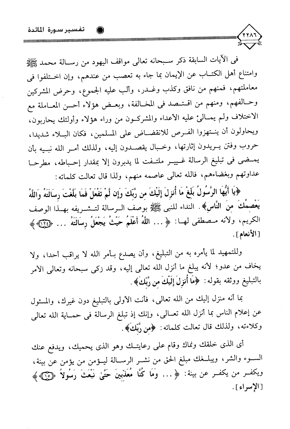 فى الآيات السابقة ذكر سبحانه تعالى مواقف اليهود من رسالة محمد - صلى الله عليه وسلم - وامتناع أهل الكتاب عن الإيمان بما جاء به تعصب من عندهم، وإن اختلفوا في معاملتهم، فمنهم من نافق وكذب وغدر، وألب عليه الجموع، وحرض المشركين وحالفهم، ومنهم من اقتصد في المخالفة، وبعض هؤلاء أحسن المعاملة مع الاختلاف ولم يمالئ عليه الأعداء والمشركون من وراء هؤلاء وأولئك يحاربون، ويحاولون أن ينتهزوا الفرص للانقضاض على المسلمين، فكان البلاء شديدا، حروب وفق يريدون إثارتها، وخبال يقصدون إليه، ولذلك أمر الله نبيه بأن يمضي في تبليغ الرسالة غير ملتفت لما يدبرون إلا بمقدار إحباطه، مطرحا عداوتهم وبغضاءهم، فالله تعالى عاصمه منهم، ولذا قال تعالت كلماته: