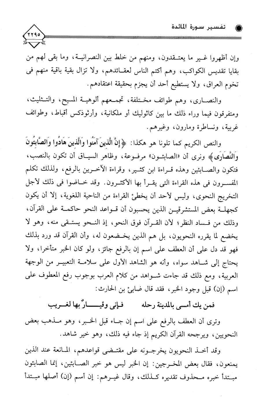 والنص الكريم كما تلونا هو هكذا: (إِنَّ الَّذِينَ آمَنُوا وَالَّذِينَ هَادُوا وَالصَّابِئُونَ وَالنَّصَارَى) ونرى أن " الصابئون " مرفوعة، وظاهر السياق أن تكون بالنصب، فتكون والصابئين وهذه قراءة ابن كثير، وقراءة الآخرين بالرفع، ولذلك تكلم المفسرون في هذه القراءة التي يقرأ بها الأكثرون. وقد خاضوا في ذلك لأجل التخريج النحوي، وليس لأحد أن يخطِّئ القراءة من الناحية اللغوية، إلا أن يكون كجهلة بعض المستشرقين الذين يحسبون أن قواعد النحو حاكمة على القرآن، وذلك من فساد النظر؛ لأن القرآن فوق النحو، إذ النحو يستقى منه، وهو لا يخضع لما يقرره النحويون، بل هم الذين يخضعون له، وأن القرآن قد ورد بذلك فهو قد دل على أن العطف على اسم إن بالرفع جائز، ولو كان الخبر متأخرا، ولا يحتاج إلى شاهد سواه، وأنه هو الشاهد الأول على سلامة التعبير من الوجهة العربية، ومع ذلك قد جاءت شواهد من كلام العرب بوجوب رفع المعطوف على اسم (إن) قبل وجود الخبر، فقد قال ضابي بن الحارث: