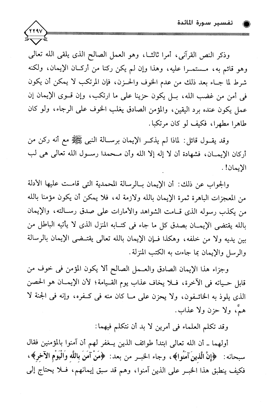 وذكر النص القرآني، أمرا ثالثا، وهو العمل الصالح الذي يلقى الله تعالى وهو قائم به، مستمرا عليه، وهذا وإن لم يكن ركنا من أركان الإيمان، ولكنه شرط لما جاء بعد ذلك من عدم الخوف والحزن، فإن المرتكب لَا يمكن أن يكون في أمن من غضب الله، بل يكون حزينا على ما ارتكب، وإن قوى الإيمان إن عمل يكون عنده برد اليقين، والمؤمن الصادق يغلب الخوف على الرجاء، ولو كان طاهرا مطهرا، فكيف لو كان مرتكبا.