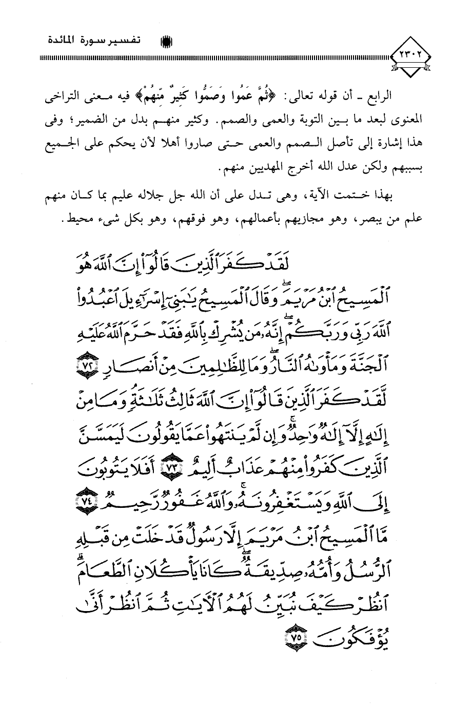 (لَقَدْ كَفَرَ الَّذِينَ قَالُوا إِنَّ اللَّهَ هُوَ الْمَسِيحُ ابْنُ مَرْيَمَ وَقَالَ الْمَسِيحُ يَا بَنِي إِسْرَائِيلَ اعْبُدُوا اللَّهَ رَبِّي وَرَبَّكُمْ إِنَّهُ مَنْ يُشْرِكْ بِاللَّهِ فَقَدْ حَرَّمَ اللَّهُ عَلَيْهِ الْجَنَّةَ وَمَأْوَاهُ النَّارُ وَمَا لِلظَّالِمِينَ مِنْ أَنْصَارٍ (72) لَقَدْ كَفَرَ الَّذِينَ قَالُوا إِنَّ اللَّهَ ثَالِثُ ثَلَاثَةٍ وَمَا مِنْ إِلَهٍ إِلَّا إِلَهٌ وَاحِدٌ وَإِنْ لَمْ يَنْتَهُوا عَمَّا يَقُولُونَ لَيَمَسَّنَّ الَّذِينَ كَفَرُوا مِنْهُمْ عَذَابٌ أَلِيمٌ (73) أَفَلَا يَتُوبُونَ إِلَى اللَّهِ وَيَسْتَغْفِرُونَهُ وَاللَّهُ غَفُورٌ رَحِيمٌ (74) مَا الْمَسِيحُ ابْنُ مَرْيَمَ إِلَّا رَسُولٌ قَدْ خَلَتْ مِنْ قَبْلِهِ الرُّسُلُ وَأُمُّهُ صِدِّيقَةٌ كَانَا يَأْكُلَانِ الطَّعَامَ انْظُرْ كَيْفَ نُبَيِّنُ لَهُمُ الْآيَاتِ ثُمَّ انْظُرْ أَنَّى يُؤْفَكُونَ (75)