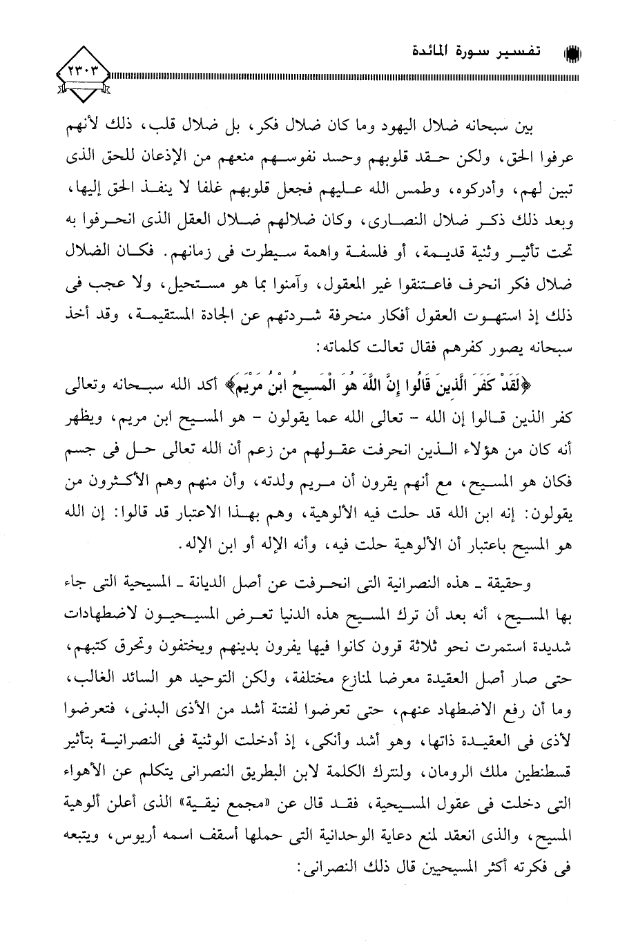 (لَقَدْ كَفَرَ الَّذِينَ قَالُوا إِنَّ اللَّهَ هُوَ الْمَسِيحُ ابْنُ مَرْيَمَ) أكد الله سبحانه وتعالى كفر الذين قالوا إن الله - تعالى الله عما يقولون - هو المسيح ابن مريم، ويظهر أنه كان من هؤلاء الذين انحرفت عقولهم من زعم أن الله تعالى حل في جسم فكان هو المسيح، مع أنهم يقرون أن مريم ولدته، وأن منهم وهم الأكثرون من يقولون: إنه ابن الله قد حلت فيه الألوهية، وهم بهذا الاعتبار قد قالوا: إن الله هو المسيح باعتبار أن الألوهية حلت فيه، وأنه الإله أو ابن الإله.
