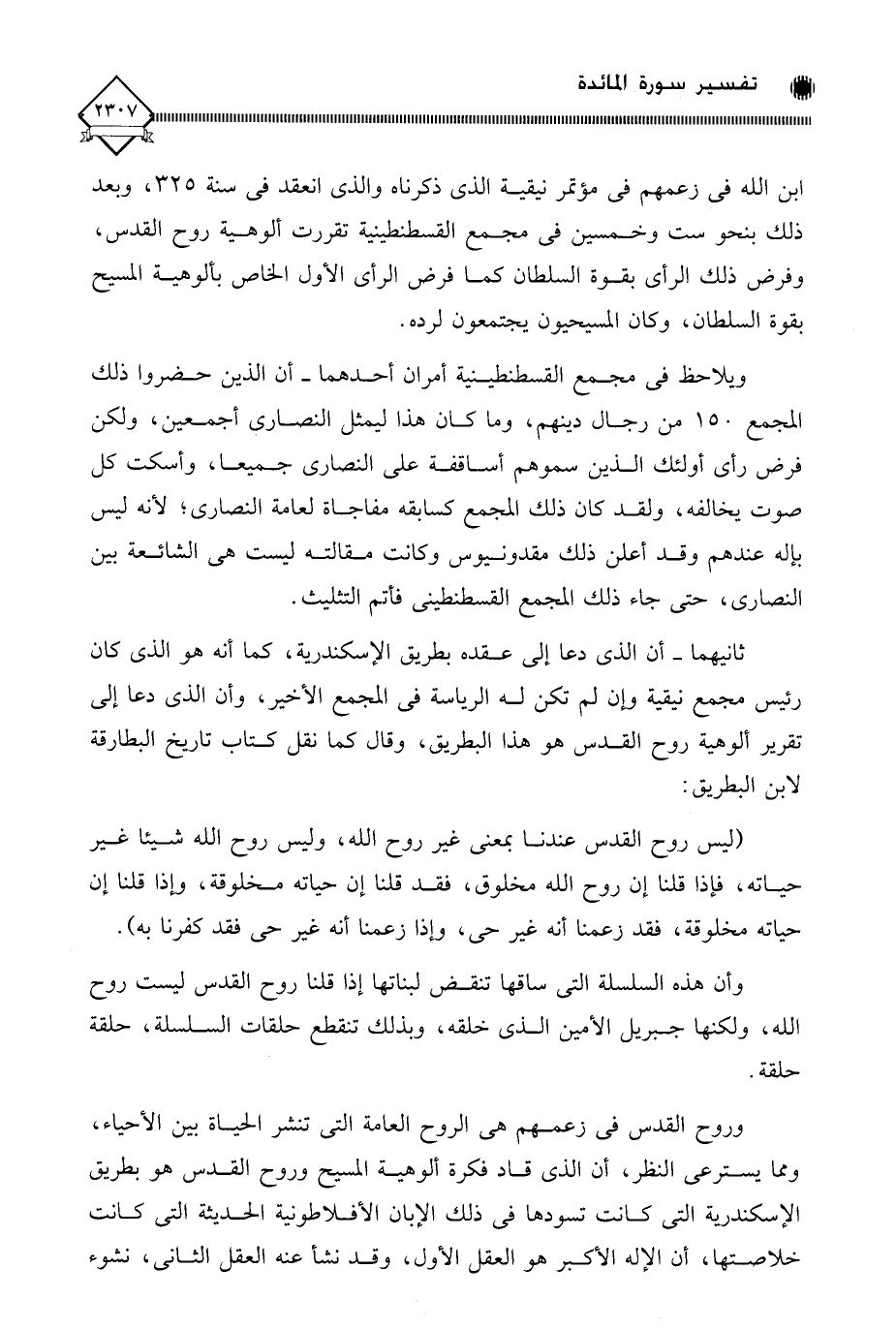 ابن الله في زعمهم في مؤتمر نيقية الذي ذكرناه والذي انعقد في سنة 325، وبعد ذلك بنحو ست وخمسين في مجمع القسطنطينية تقررت ألوهية روح القدس، وفرض ذلك الرأي بقوة السلطان كما فرض الرأي الأول الخاص بألوهية المسيح بقوة السلطان، وكان المسيحيون يجتمعون لرده.