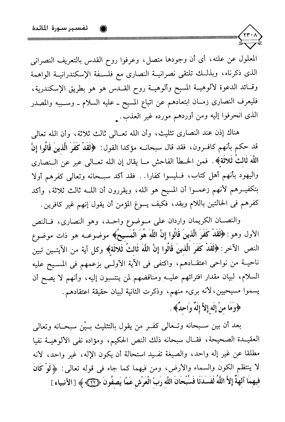 هناك إذن غند النصارى تثليث، وأن الله تعالى ثالث ثلاثة، وأن الله تعالى قد حكم بأنهم كافرون، فقد قال سبحانه مؤكدا القول: (لَقَدْ كَفَرَ الَّذِينَ قَالُوا إِنَّ اللَّهَ ثَالِثُ ثَلاثة). فمن الخطأ الفاحش ما يقال إن الله تعالى عبر عن النصارى واليهود بأنهم أهل كتاب، فليسوا كفارا. . فقد أكد سبحانه وتعالى كفرهم أولا بتكفيرهم لأنهم زعموا أن المسيح هو الله، ويقررون أن الله ثالث ثلاثة، وأكد كفرهم في الحالتين باللام وبقد، فكيف يسوغ المؤمن أن يقول إنهم غير كافرين.