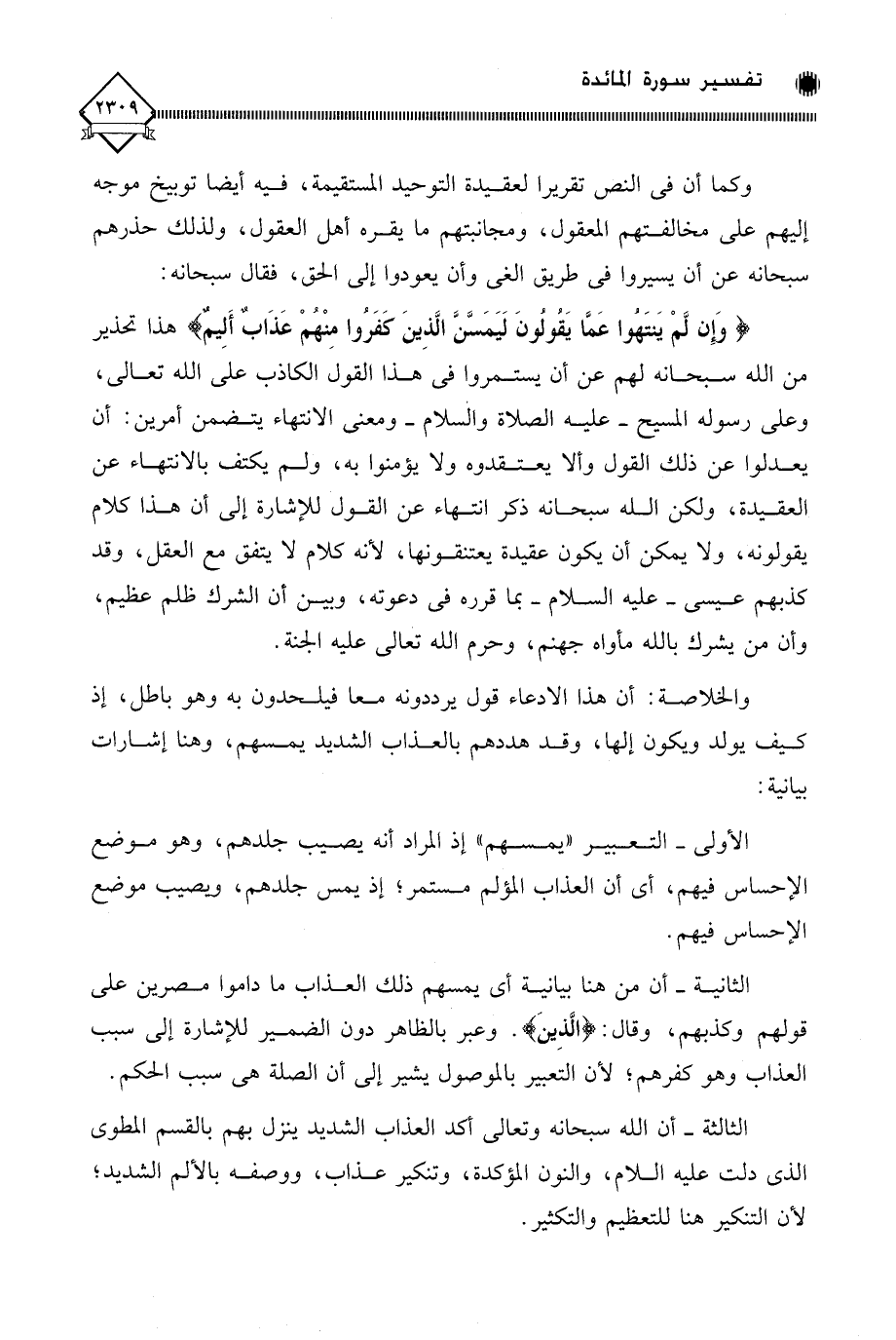 (وَإِن لَّمْ يَنتَهُوا عَمَّا يَقُولُونَ لَيَمَسَّنَّ الَّذِينَ كَفَرُوا مِنْهُمْ عَذَابٌ أَلِيمٌ) هذا تحذير من الله سبحانه لهم عن أن يستمروا في هذا القول الكاذب على الله تعالى، وعلى رسوله المسيح - عليه الصلاة والسلام - ومعنى الانتهاء يتضمن أمرين: أن يعدلوا عن ذلك القول وألا يعتقدوه ولا يؤمنوا به، ولم يكتف بالانتهاء عن العقيدة، ولكن الله سبحانه ذكر انتهاء عن القول للإشارة إلى أن هذا كلام يقولونه، ولا يمكن أن يكون عقيدة يعتنقونها، لأنه كلام لَا يتفق مع العقل، وقد كذبهم عيسى - عليه السلام - بما قرره في دعوته، وبين أن الشرك ظلم عظيم، وأن من يشرك بالله مأواه جهنم، وحرم الله تعالى عليه الجنة.