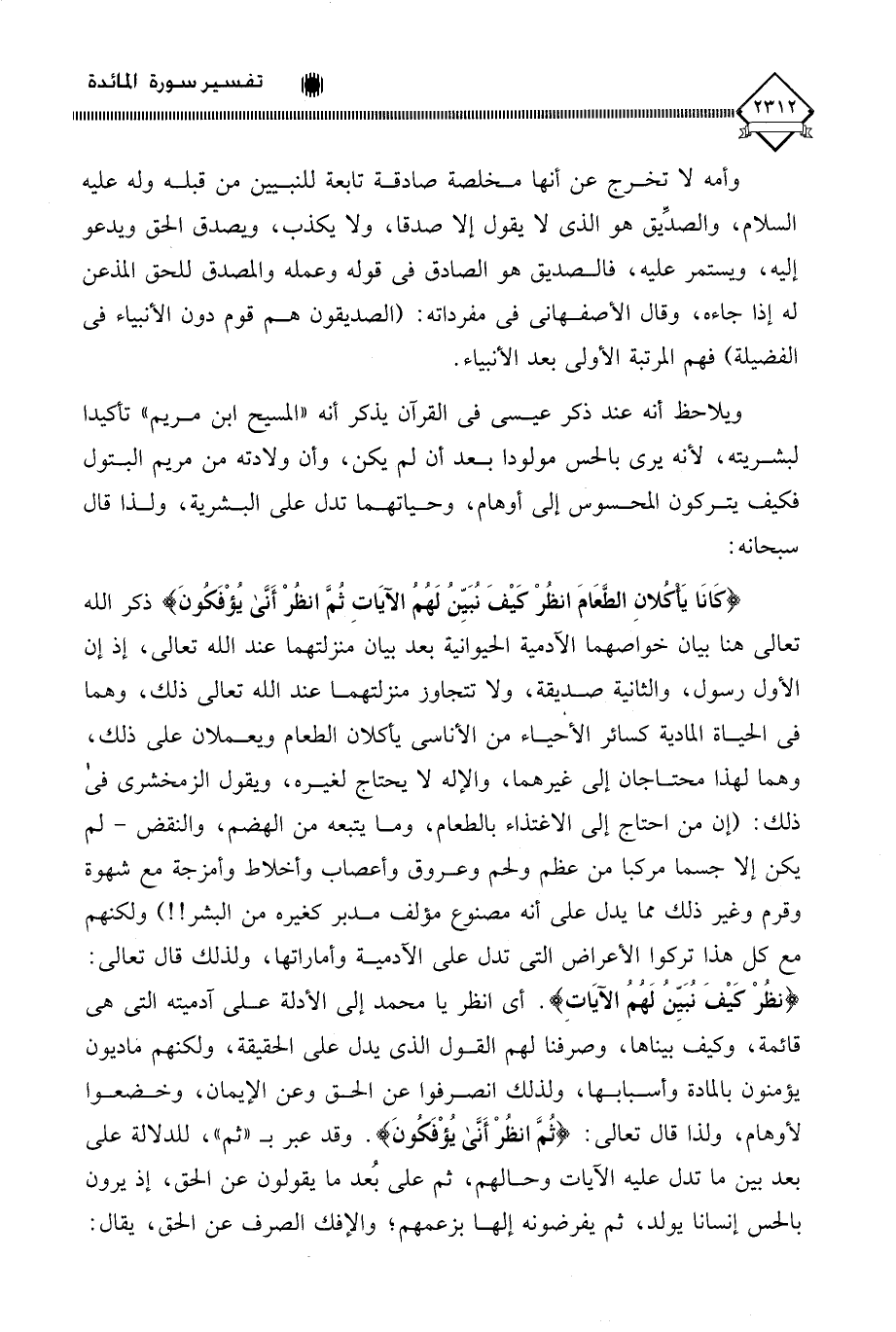 (كَانَا يَأْكُلَانِ الطَّعَامَ انْظُرْ كَيْفَ نُبَيِّنُ لَهُمُ الْآيَاتِ ثُمَّ انْظُرْ أَنَّى يُؤْفَكُونَ) ذكر الله تعالى هنا بيان خواصهما الآدمية الحيوانية بعد بيان منزلتهما عند الله تعالى، إذ إن الأول رسول، والثانية صديقة، ولا تتجاوز منزلتهما عند الله تعالى ذلك، وهما في الحياة المادية كسائر الأخياء من الأناسي يأكان الطعام ويعملان على ذلك، وهما لهذا محتاجان إلى غيرهما، والإله لَا يحتاج لغيره، ويقول الزمخشري في ذلك: (إن من احتاج إلى الاغتذاء بالطعام، وما يتبعه من الهضم، والنقض - لم يكن إلا جسما مركبا من عظم ولحم وعروق وأعصاب وأخلاط وأمزجة مع شهوة وقرم وغير ذلك مما يدل على أنه مصنوع مؤلف مدبر كغيره من البشر!!) ولكنهم مع كل هذا تركوا الأعراض التي تدل على الآدمية وأماراتها، ولذلك قال تعالى: (انظُرْ كيْفَ نُبَيِّن لَهُمُ الآيَاتِ). أي انظر يا محمد إلى الأدلة على آدميته التي هي قائمة، وكيف بيناها، وصرفنا لهم القول الذي يدل على الحقيقة، ولكنهم ماديون يؤمنون بالمادة وأسبابها، ولذلك انصرفوا عن الحق وعن الإيمان، وخضعوا لأوهام، ولذا قال تعالى: (ثمَّ انطرْ أَنَّى يُؤْفَكُونَ). وقد عبر بـ " ثم "، للدلالة على بعد بين ما تدل عليه الآيات وحالهم، ثم على بُعد ما يقولون عن الحق، إذ يرون بالحس إنسانا يولد، ثم يفرضونه إلها بزعمهم؛ والإفك الصرف عن الحق، يقال: