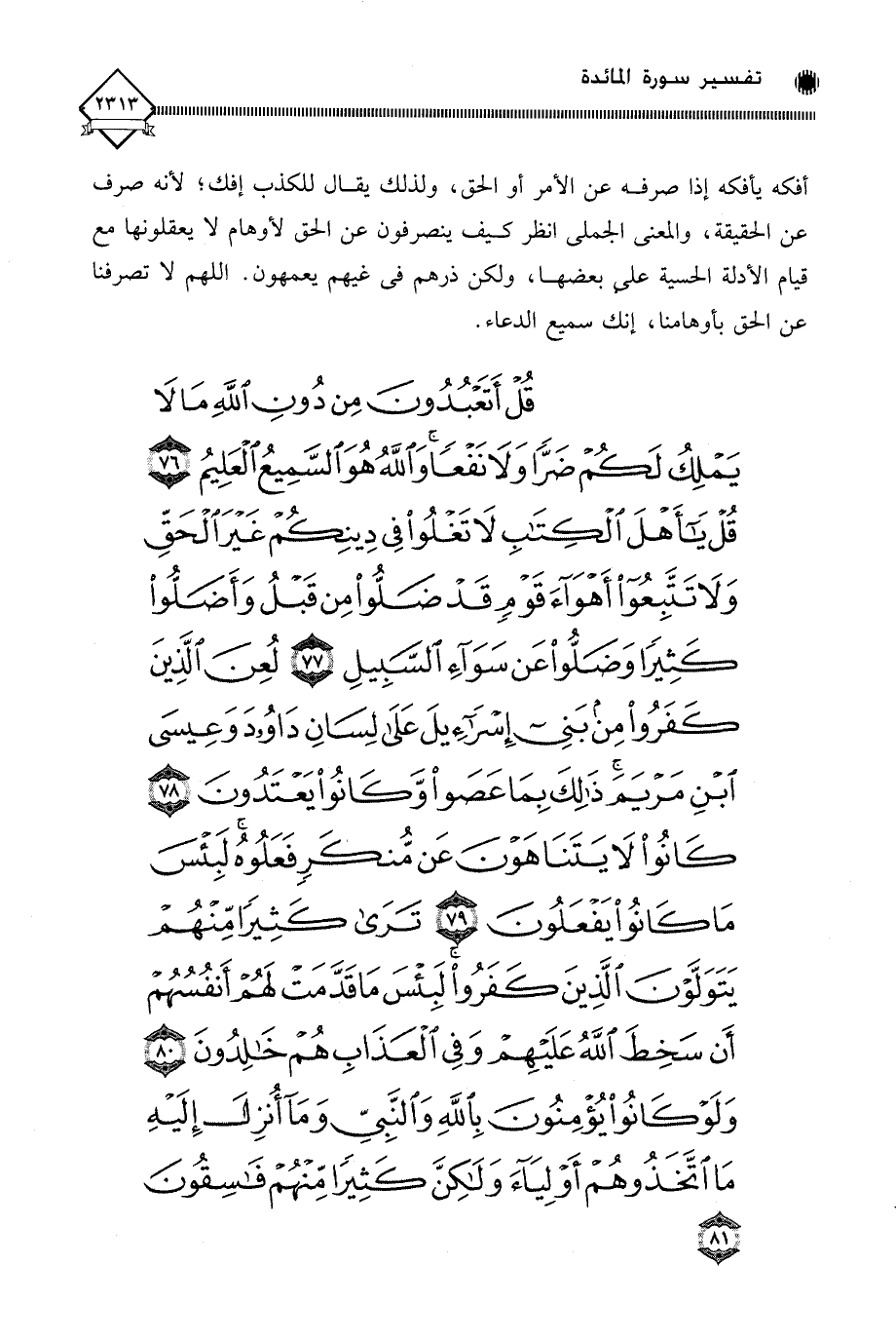 (قُلْ أَتَعْبُدُونَ مِنْ دُونِ اللَّهِ مَا لَا يَمْلِكُ لَكُمْ ضَرًّا وَلَا نَفْعًا وَاللَّهُ هُوَ السَّمِيعُ الْعَلِيمُ (76) قُلْ يَا أَهْلَ الْكِتَابِ لَا تَغْلُوا فِي دِينِكُمْ غَيْرَ الْحَقِّ وَلَا تَتَّبِعُوا أَهْوَاءَ قَوْمٍ قَدْ ضَلُّوا مِنْ قَبْلُ وَأَضَلُّوا كَثِيرًا وَضَلُّوا عَنْ سَوَاءِ السَّبِيلِ (77) لُعِنَ الَّذِينَ كَفَرُوا مِنْ بَنِي إِسْرَائِيلَ عَلَى لِسَانِ دَاوُودَ وَعِيسَى ابْنِ مَرْيَمَ ذَلِكَ بِمَا عَصَوْا وَكَانُوا يَعْتَدُونَ (78) كَانُوا لَا يَتَنَاهَوْنَ عَنْ مُنْكَرٍ فَعَلُوهُ لَبِئْسَ مَا كَانُوا يَفْعَلُونَ (79) تَرَى كَثِيرًا مِنْهُمْ يَتَوَلَّوْنَ الَّذِينَ كَفَرُوا لَبِئْسَ مَا قَدَّمَتْ لَهُمْ أَنْفُسُهُمْ أَنْ سَخِطَ اللَّهُ عَلَيْهِمْ وَفِي الْعَذَابِ هُمْ خَالِدُونَ (80) وَلَوْ كَانُوا يُؤْمِنُونَ بِاللَّهِ وَالنَّبِيِّ وَمَا أُنْزِلَ إِلَيْهِ مَا اتَّخَذُوهُمْ أَوْلِيَاءَ وَلَكِنَّ كَثِيرًا مِنْهُمْ فَاسِقُونَ (81)