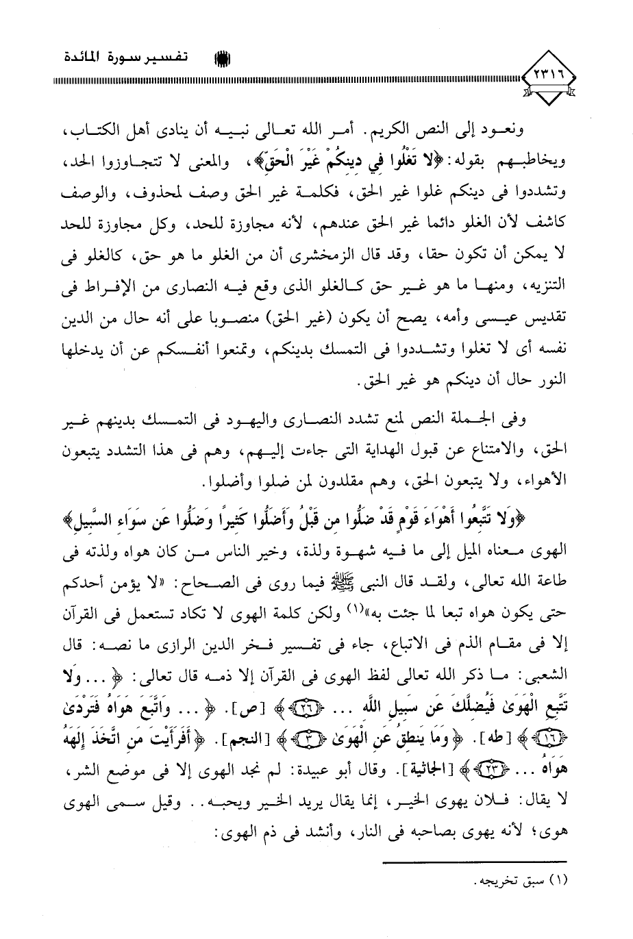 ونعود إلى النص الكريم. أمر الله تعالى نبيه أن ينادي أهل الكتاب، ويخاطبهم بقوله: (لا تَغْلُوا فِي دِينِكُمْ غَيْرَ الْحَقِّ)، والمعنى لَا تتجاوزوا الحد، وتشددوا في دينكم غلوا غير الحق، فكلمة غير الحق وصف لمحذوف، والوصف كاشف لأن الغلو دائما غير الحق عندهم، لأنه مجاوزة للحد، وكل مجاوزة للحد لا يمكن أن تكون حقا، وقد قال الزمخشري أن من الغلو ما هو حق، كالغلو في التنزيه، ومنها ما هو غير حق كالغلو الذي وقع فيه النصارى من الإفراط في تقديس عيسى وأمه، يصح أن يكون (غير الحق) منصوبا على أنه حال من الدين نفسه أي لَا تغلوا وتشددوا في التمسك بدينكم، وتمنعوا أنفسكم عن أن يدخلها النور حال أن دينكم هو غير الحق.