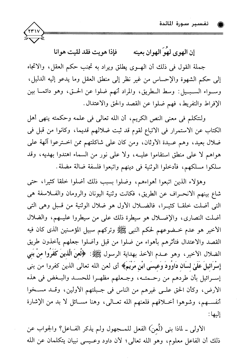 ولنتكلم في معنى النص الكريم، أن الله تعالى في علمه وحكمته ينهى أهل الكتاب عن الاستمرار في الاتباع لقوم قد ثبت ضلالهم قديما، وكانوا من قبل في ضلال بعيد، وهم عبدة الأوثان، ومن كان على شاكلتهم ممن اخترعوا آلهة على هواهم لَا على منطق استقاموا عليه، ولا على نور من السماء اهتدوا بهديه، وقد سلكوا مسلكهم، فأدخلوا الوثنية في دينهم واتبعوا فلسفة ضالة مضلة.