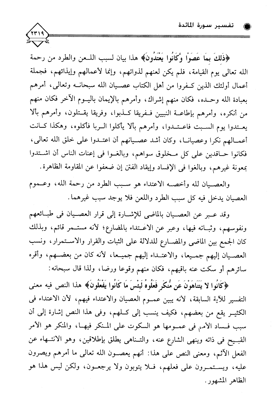 هذا النص فيه معنى التفسير للآية السابقة، لأنه يبين عموم العصيان والاعتداء فيهم، لأن الاعتداء في الكثير يقع من بعضهم، فكيف ينسب إلى كلهم، وفي هذا النص إشارة إلى أن سبب فساد الأمم في عمومها هو السكوت على المنكر فيها، والمنكر هو الأمر القبيح في ذاته وينهى الشارع عنه، والتناهي يطلق بإطلاقين، وهو الانتهاء عن الفعل الآثم، ومعنى النص على هذا: أنهم يعصون الله تعالى ما أمرهم ويصرون عليه، ويستمرون على فعلهم، فلا يتوبون ولا يرجعون، ولكن ليس هذا هو الظاهر المشهور.
