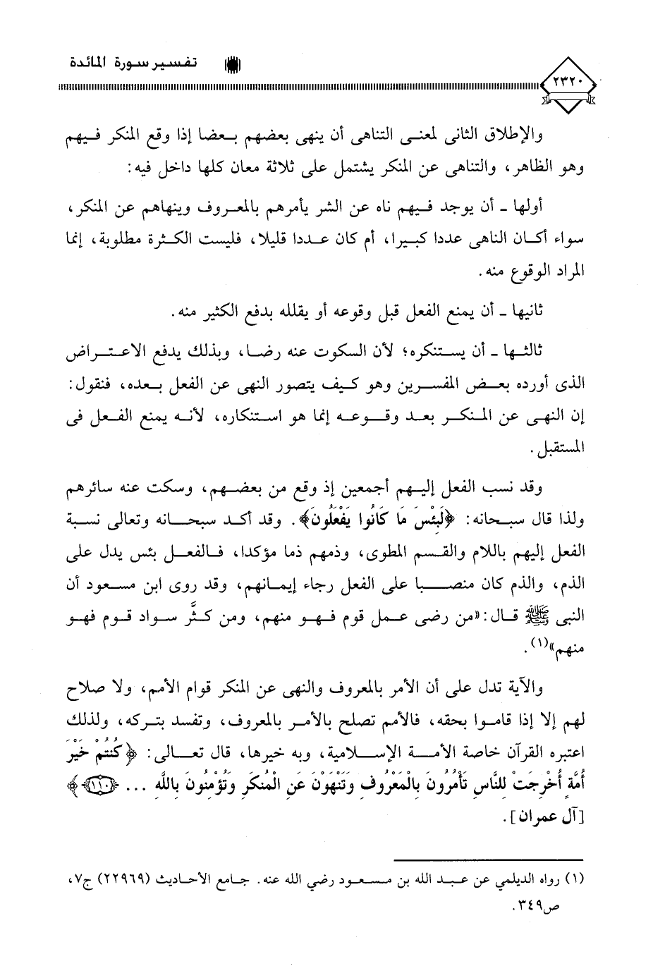 والإطلاق الثاني لمعنى التناهي أن ينهى بعضهم بعضا إذا وقع المنكر فيهم وهو الظاهر، والتناهي عن المنكر يشتمل على ثلاثة معان كلها داخل فيه: أولها - أن يوجد فيهم ناه عن الشر يأمرهم بالمعروف وينهاهم عن المنكر، سواء أكان الناهي عددا كبيرا، أم كان عددا قليلا، فليست الكثرة مطلوبة، إنما المراد الوقوع منه.