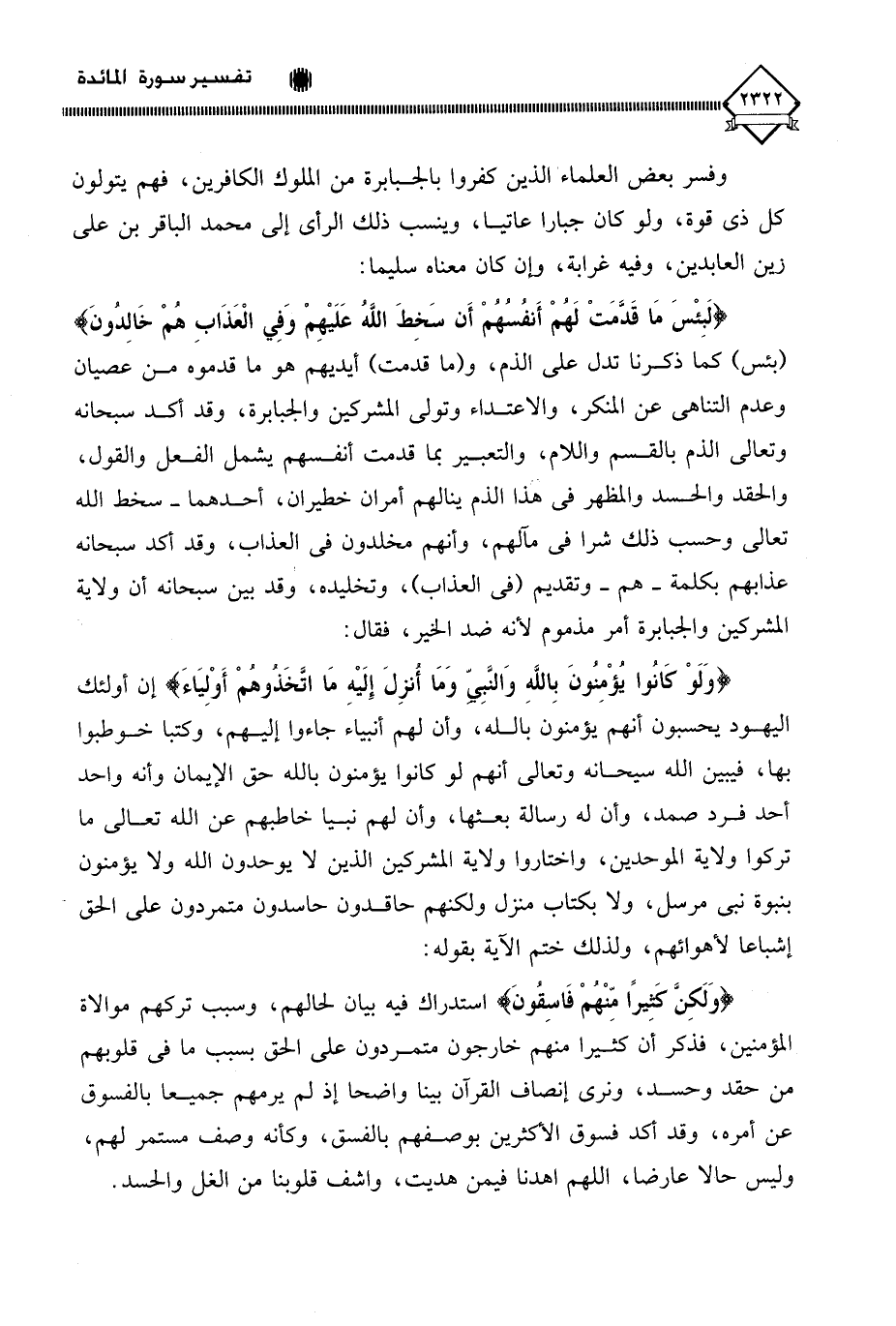 (وَلَكِنَّ كَثِيرًا مِّنْهُمْ فَاسِقُونَ) استدراك فيه بيان لحالهم، وسبب تركهم موالاة المؤمنين، فذكر أن كثيرا منهم خارجون متمردون على الحق بسبب ما في قلوبهم من حقد وحسد، ونرى إنصاف القرآن بينا واضحا إذ لم يرمهم جميعا بالفسوق عن أمره، وقد أكد فسوق الأكثرين بوصفهم بالفسق، وكأنه وصف مستمر لهم، وليس حالا عارضا، اللهم اهدنا فيمن هديت، واشف قلوبنا من الغل والحسد.