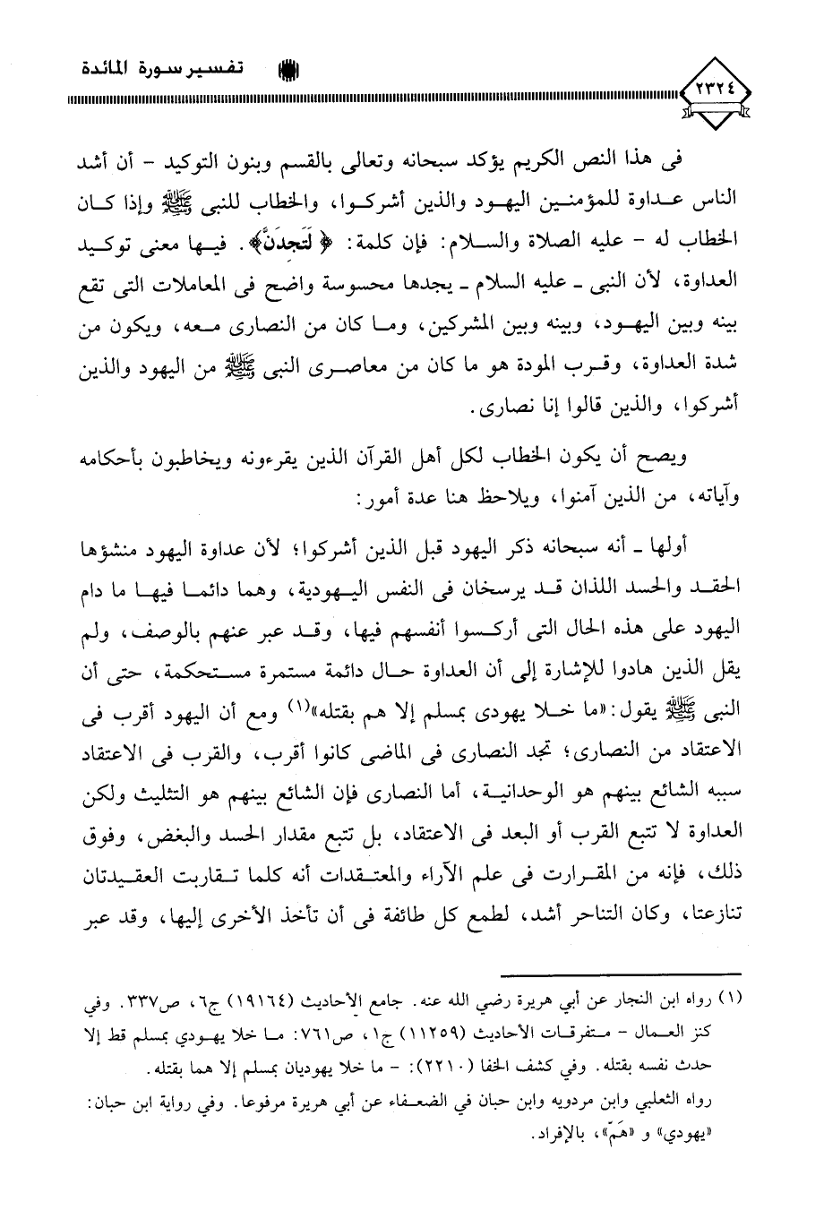 فى هذا النص الكريم يؤكد سبحانه وتعالى بالقسم وبنون التوكيد - أن أشد الناس عداوة للمؤمنين اليهود والذين أشركوا، والخطاب للنبي - صلى الله عليه وسلم - وإذا كان الخطاب له - عليه الصلاة والسلام: فإن كلمة: