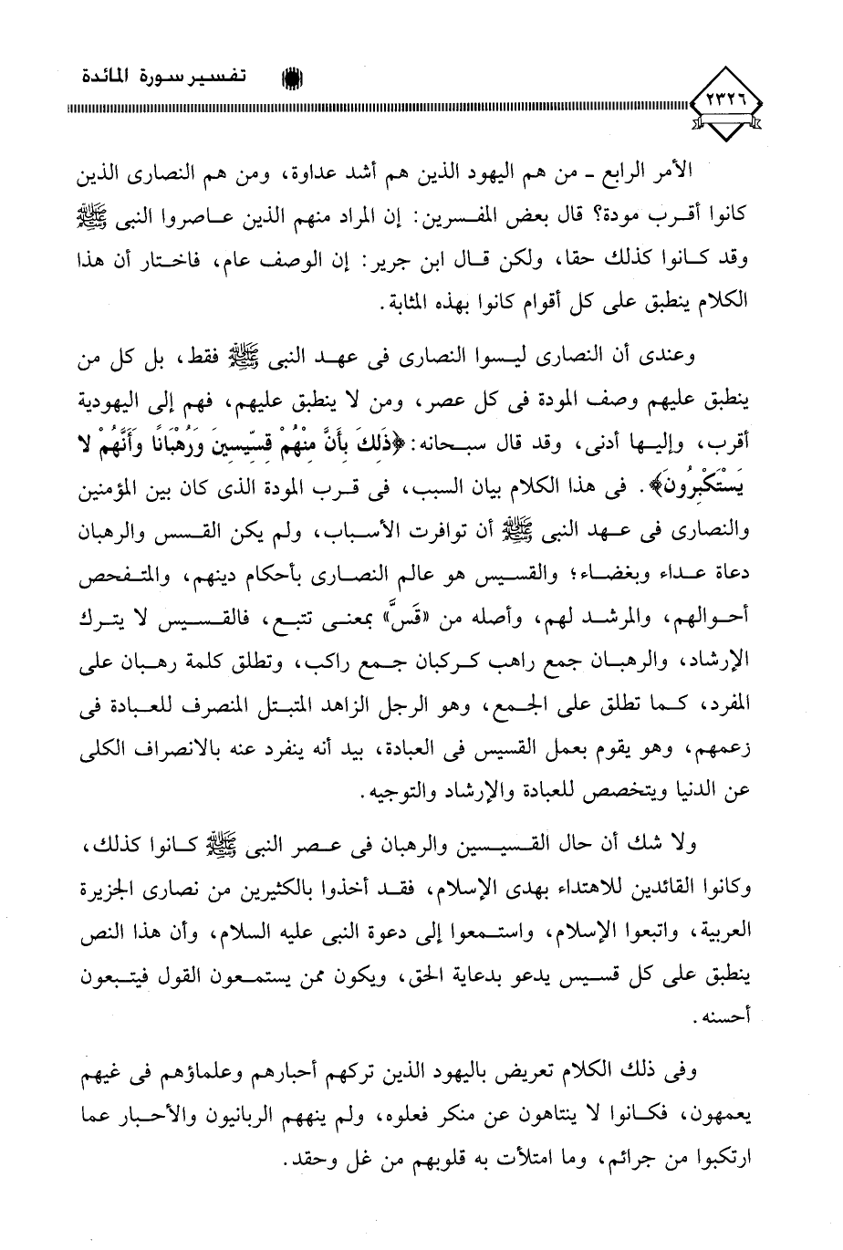 الأمر الرابع - من هم اليهود الذين هم أشد عداوة، ومن هم النصارى الذين كانوا أقرب مودة؛ قال بعض المفسرين: إن المراد منهم الذين عاصروا النبي - صلى الله عليه وسلم - وقد كانوا كذلك حقا، ولكن قال ابن جرير: إن الوصف عام، فاختار أن هذا الكلام ينطبق على كل أقوام كانوا بهذه المثابة.