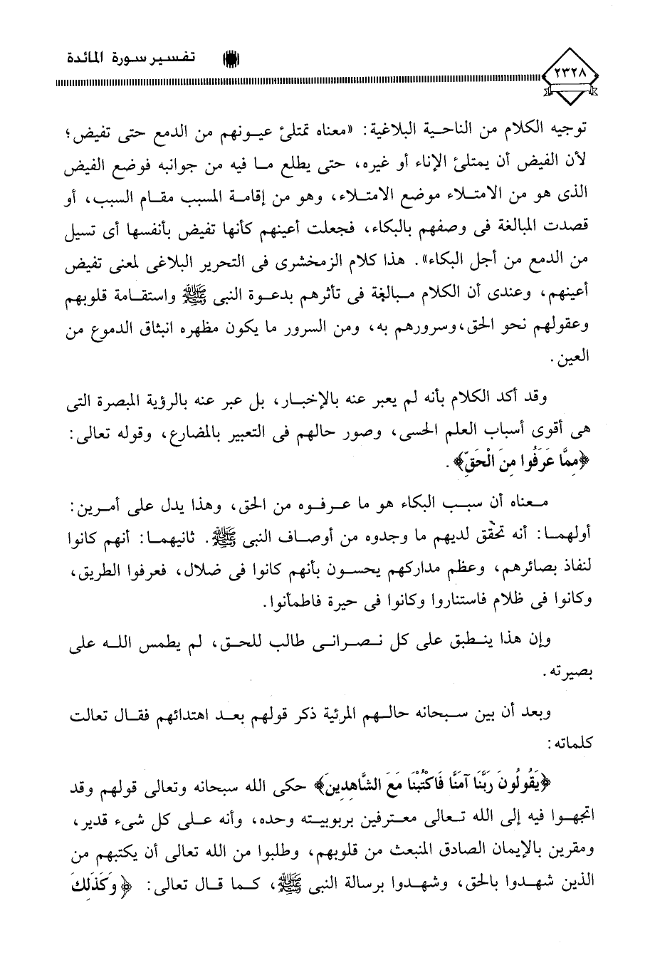 توجيه الكلام من الناحية البلاغية: " معناه تمتلئ عيونهم من الدمع حتى تفيض، لأن الفيض أن يمتلئ الإناء أو غيره، حتى يطلع ما فيه من جوانبه فوضع الفيض الذي هو من الامتلاء موضع الامتلاء، وهو من إقامة المسبب مقام السبب، أو قصدت المبالغة في وصفهم بالبكاء، فجعلت أعينهم كأنها تفيض بأنفسها أي تسيل من الدمع من أجل البكاء ". هذا كلام الزمخشري في التحرير البلاغي لمعنى تفيض أعينهم، وعندي أن الكلام مبالجة في تأثرهم بدعوة النبي - صلى الله عليه وسلم - واستقامة قلوبهم وعقولهم نحو الحق، وسرورهم به، ومن السرور ما يكون مظهره انبثاق الدموع من العين.