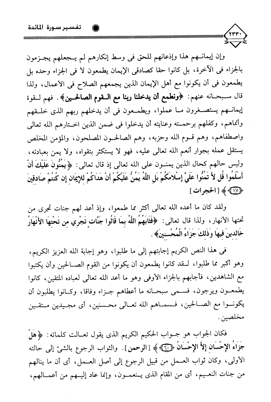 في هذا النص الكريم إجابتهم إلى ما طلبوا، وهو إجابة الله العزيز الكريم، وهو أكبر مما طلبوا، لقد كانوا يطمعون أن يكونوا من القوم الصالحين وأن يكتبوا مع الشاهدين، فأجابهم بالجزاء الأوفى وهو ما أعد الله تعالى لعباده المتقين، كانوا يطمعون ويرجون، فسمى سبحانه ما أعطاهم جزاء وفاقا، وكانوا يطلبون أن يكونوا مع الصالحين، فسماهم الله تعالى محسنين، أي مجيدين متقين مخلصين.