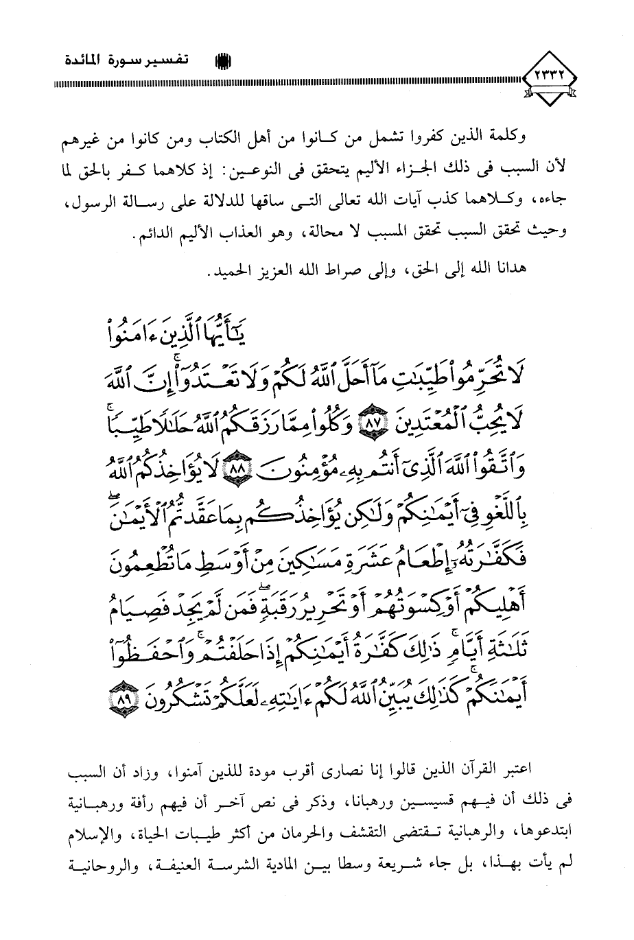 (يَا أَيُّهَا الَّذِينَ آمَنُوا لَا تُحَرِّمُوا طَيِّبَاتِ مَا أَحَلَّ اللَّهُ لَكُمْ وَلَا تَعْتَدُوا إِنَّ اللَّهَ لَا يُحِبُّ الْمُعْتَدِينَ (87) وَكُلُوا مِمَّا رَزَقَكُمُ اللَّهُ حَلَالًا طَيِّبًا وَاتَّقُوا اللَّهَ الَّذِي أَنْتُمْ بِهِ مُؤْمِنُونَ (88) لَا يُؤَاخِذُكُمُ اللَّهُ بِاللَّغْوِ فِي أَيْمَانِكُمْ وَلَكِنْ يُؤَاخِذُكُمْ بِمَا عَقَّدْتُمُ الْأَيْمَانَ فَكَفَّارَتُهُ إِطْعَامُ عَشَرَةِ مَسَاكِينَ مِنْ أَوْسَطِ مَا تُطْعِمُونَ أَهْلِيكُمْ أَوْ كِسْوَتُهُمْ أَوْ تَحْرِيرُ رَقَبَةٍ فَمَنْ لَمْ يَجِدْ فَصِيَامُ ثَلَاثَةِ أَيَّامٍ ذَلِكَ كَفَّارَةُ أَيْمَانِكُمْ إِذَا حَلَفْتُمْ وَاحْفَظُوا أَيْمَانَكُمْ كَذَلِكَ يُبَيِّنُ اللَّهُ لَكُمْ آيَاتِهِ لَعَلَّكُمْ تَشْكُرُونَ (89)