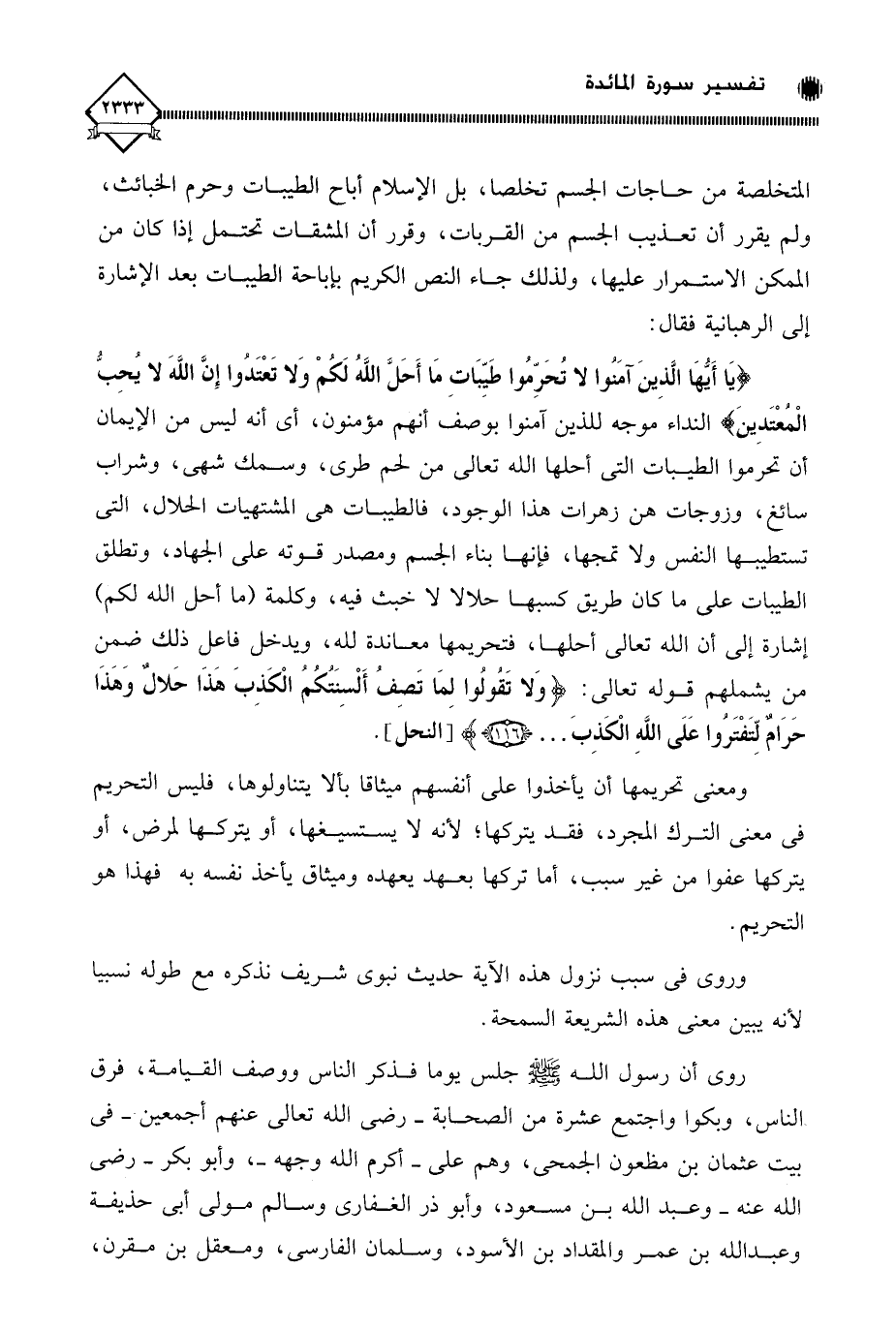 (يَا أَيُّهَا الَّذِينَ آمَنُوا لَا تُحَرِّمُوا طَيِّبَاتِ مَا أَحَل اللَّهُ لَكُمْ وَلا تَعْتَدُوا إِنَّ اللَّهَ لَا يُحِبُّ الْمُعْتَدِينَ) النداء موجه للذين آمنوا بوصف أنهم مؤمنون، أي أنه ليس من الإيمان أن تحرموا الطيبات التي أحلها الله تعالى من لحم طرى، وسمك شهي، وشراب سائغ، وزوجات هن زهرات هذا الوجود، فالطيبات هي المشتهيات الحلال، التي تستطيبها النفس ولا تمجها، فإنها بناء الجسم ومصدر قوته على الجهاد، وتطلق الطيبات على ما كان طريق كسبها حلالا لَا خبث فيه، وكلمة (ما أحل الله لكم) إشارة إلى أن الله تعالى أحلها، فتحريمها معاندة لله، ويدخل فاعل ذلك ضمن من يشملهم قوله تعالى: (وَلا تَقُولُوا لِمَا تَصِفُ أَلْسِنَتُكُمُ الْكَذِبَ هَذَا حَلالٌ وَهَذَا حَرَامٌ لتَفْتَرُوا عَلَى اللَّهِ الْكَذِبَ. . .).