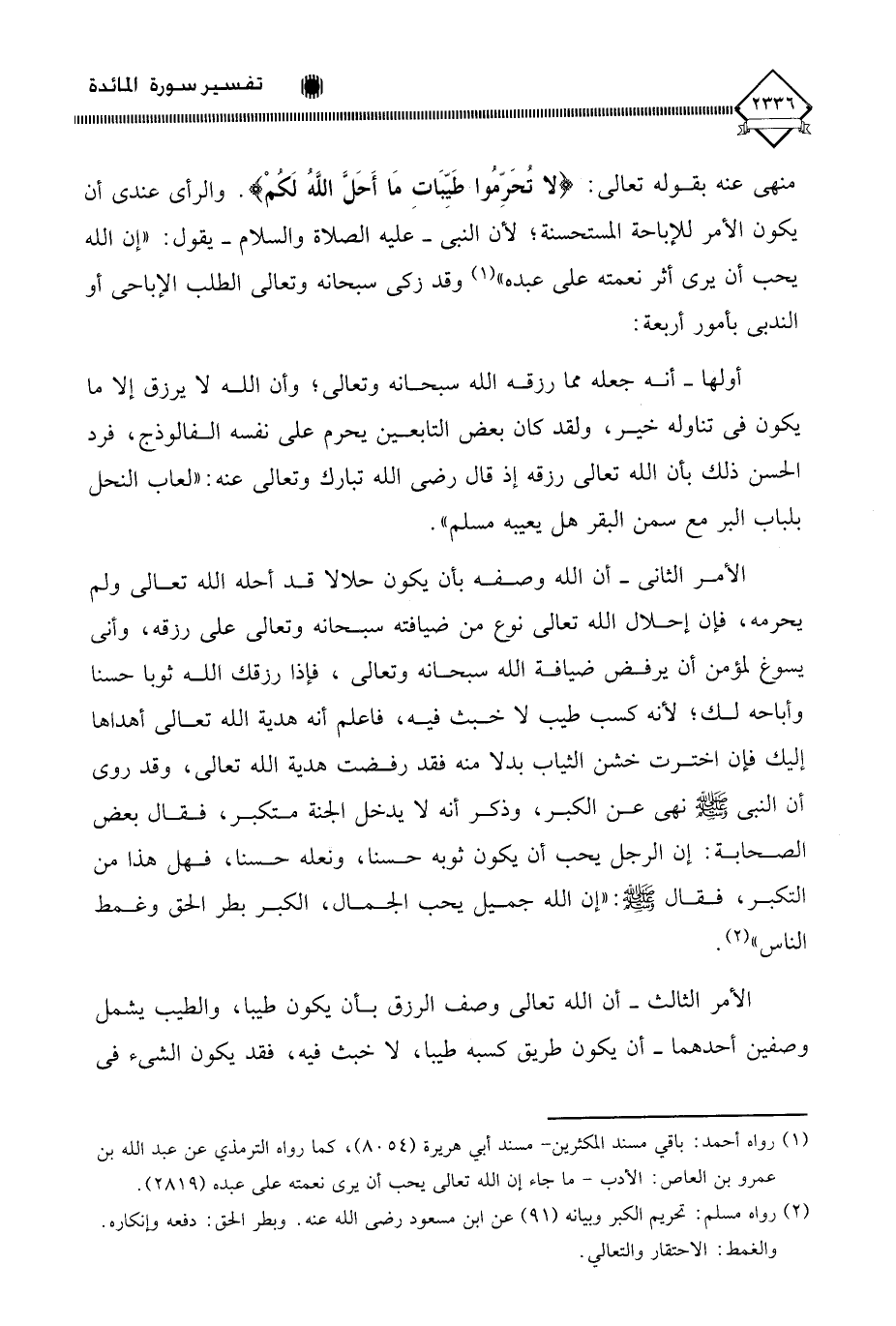 الأمر الثاني - أن الله وصفه بأن يكون حلالا قد أحله الله تعالى ولم يحرمه، فإن إحلال الله تعالى نوع من ضيافته سبحانه وتعالى على رزقه، وأنى يسوغ لمؤمن أن يرفض ضيافة الله سبحانه وتعالى، فإذا رزقك الله ثوبا حسنا وأباحه لك؛ لأنه كسب طيب لَا خبث فيه، فاعلم أنه هدية الله تعالى أهداها إليك فإن اخترت خشن الثياب بدلا منه فقد رفضت هدية الله تعالى، وقد روي أن النبي - صلى الله عليه وسلم - نهى عن الكبر، وذكر أنه لَا يدخل الجنة متكبر، فقال بعض الصحابة: إن الرجل يحب أن يكون ثوبه حسنا، ونعله حسنا، فهل هذا من التكبر، فقال - صلى الله عليه وسلم -: " إن الله جميل يحب الجمال، الكبر بطر الحق وغمط الناس " (¬2).
