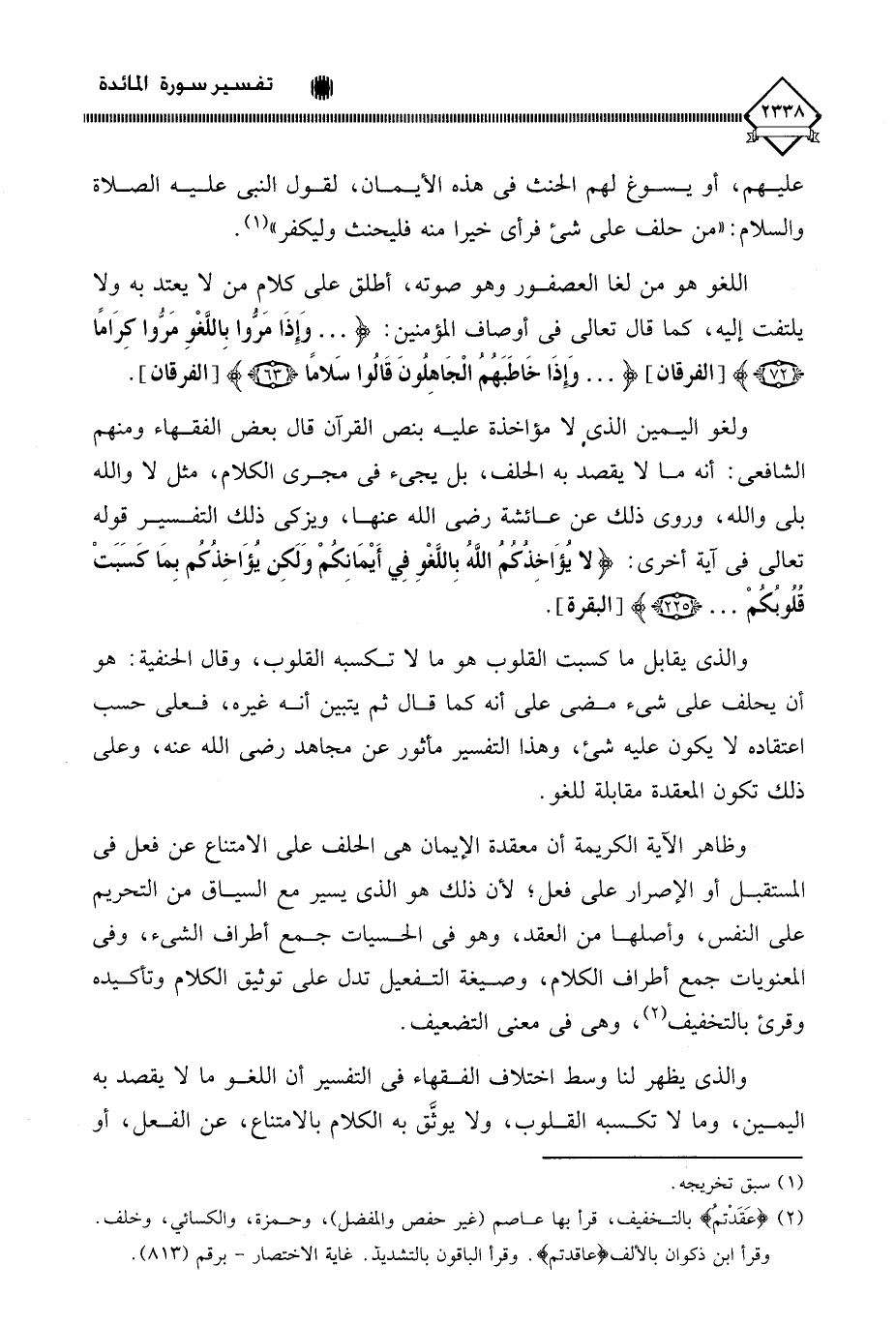 والذي يظهر لنا وسط اختلاف الفقهاء في التفسير أن اللغو ما لَا يقصد به اليمين، وما لَا تكسبه القلوب، ولا يوثَق به الكلام بالامتناع، عن الفعل، أو
