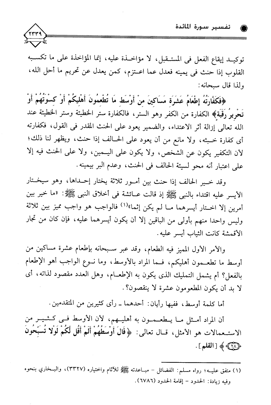 (فَكَفَّارَتُهُ إِطْعَامُ عَشَرَةِ مَسَاكِينَ مِنْ أَوْسَطِ مَا تُطْعِمُونَ أَهْلِيكُمْ أَوْ كِسْوَتُهُمْ أَوْ تَحْرِيرُ رَقَبَةٍ) الكفارة من الكفَر وهو الستر، فالكفارة ستر الخطيئة وستر الَخطيئة عند الله تعالى إزالة أثر الاعتداء، والضمير يعود على الحنث المقدر في القول، فكفارته أي كفارة خبثه، ولا مانع من أن يعود على الحالف إذا حنث، ويظهر لنا ذلك؛ لأن التكفير يكون عن الشخص، ولا يكون على اليمين، ولا على الحنث فيه إلا على اعتبار أنه محو لسيئة الحالف في الحنث، وعدم البر بيمينه.