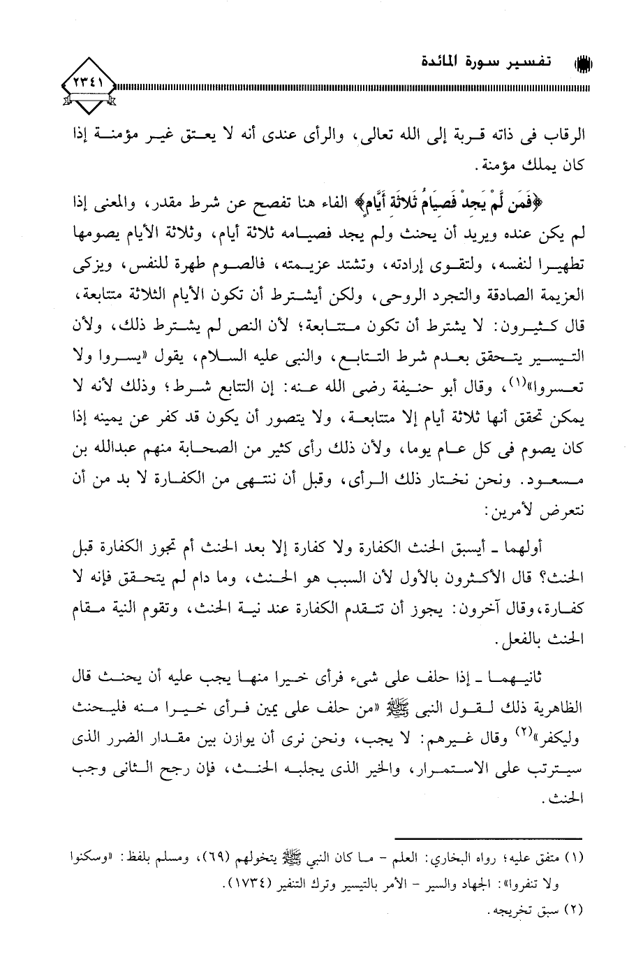 (فَمَن لَّمْ يَجِدْ فَصِيَامُ ثَلاثةِ أَيَّام) الفاء هنا تفصح عن شرط مقدر، والمعنى إذا لم يكن عنده ويريد أن يحنث ولم يجد فصيامه ثلاثة أيام، وثلاثة الأيام يصومها تطهيرا لنفسه، ولتقوى إرادته، وتشتد عزيمته، فالصوم طهرة للنفس، ويزكي العزيمة الصادقة والتجرد الروحي، ولكن أيشترط أن تكون الأيام الثلاثة متتابعة؟ قال كثيرون: لَا يشترط أن تكون متتابعة؛ لأن النص لم يشترط ذلك، ولأن التيسير يتحقق بعدم شرط التتابع، والنبي عليه السلام، يقول " يسروا ولا تعسروا " (¬1)، وقال أبو حنيفة رضي الله عنه: إن التتابع شرط؛ وذلك لأنه لا يمكن تحقق أنها ثلاثة أيام إلا متتابعة، ولا يتصور أن يكون قد كفر عن يمينه إذا كان يصوم في كل عام يوما، ولأن ذلك رأى كثير من الصحابة منهم عبد الله بن مسعود. ونحن نختار ذلك الرأي، وقبل أن ننتهي من الكفارة لَا بد من أن نتعرض الأمرين:
