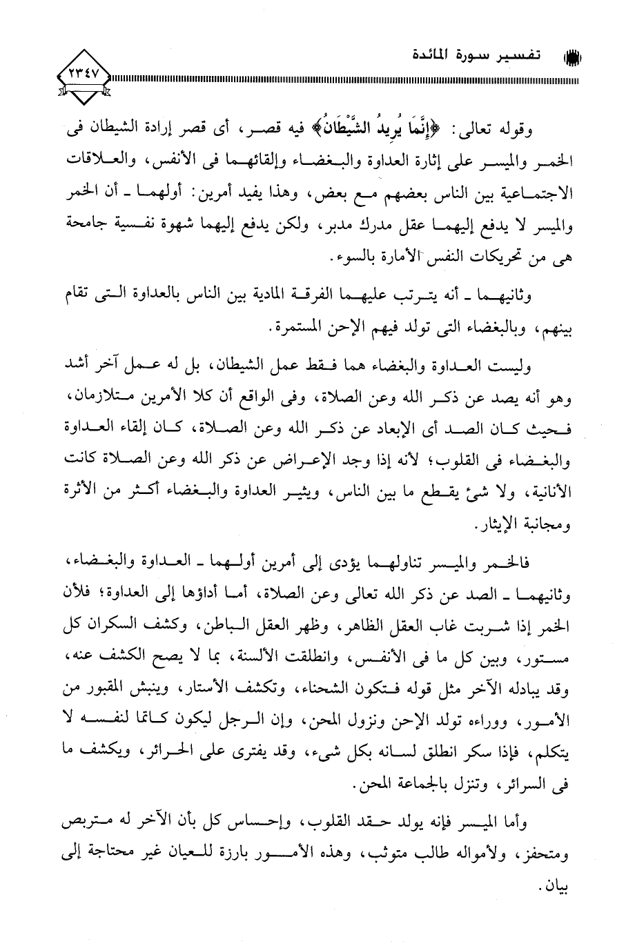 وقوله تعالى: (إِنَّمَا يرِيدُ الشَّيْطَانُ) فيه قصر، أي قصر إرادة الشيطان في الخمر والميسر على إثارة العداوة والبغضاء وإلقائهما في الأنفس، والعلاقات الاجتماعية بين الناس بعضهم مع بعض، وهذا يفيد أمرين: أولهما - أن الخمر والميسر لَا يدفع إليهما عقل مدرك مدبر، ولكن يدفع إليهما شهوة نفسية جامحة هي من تحريكات النفس الأمارة بالسوء.