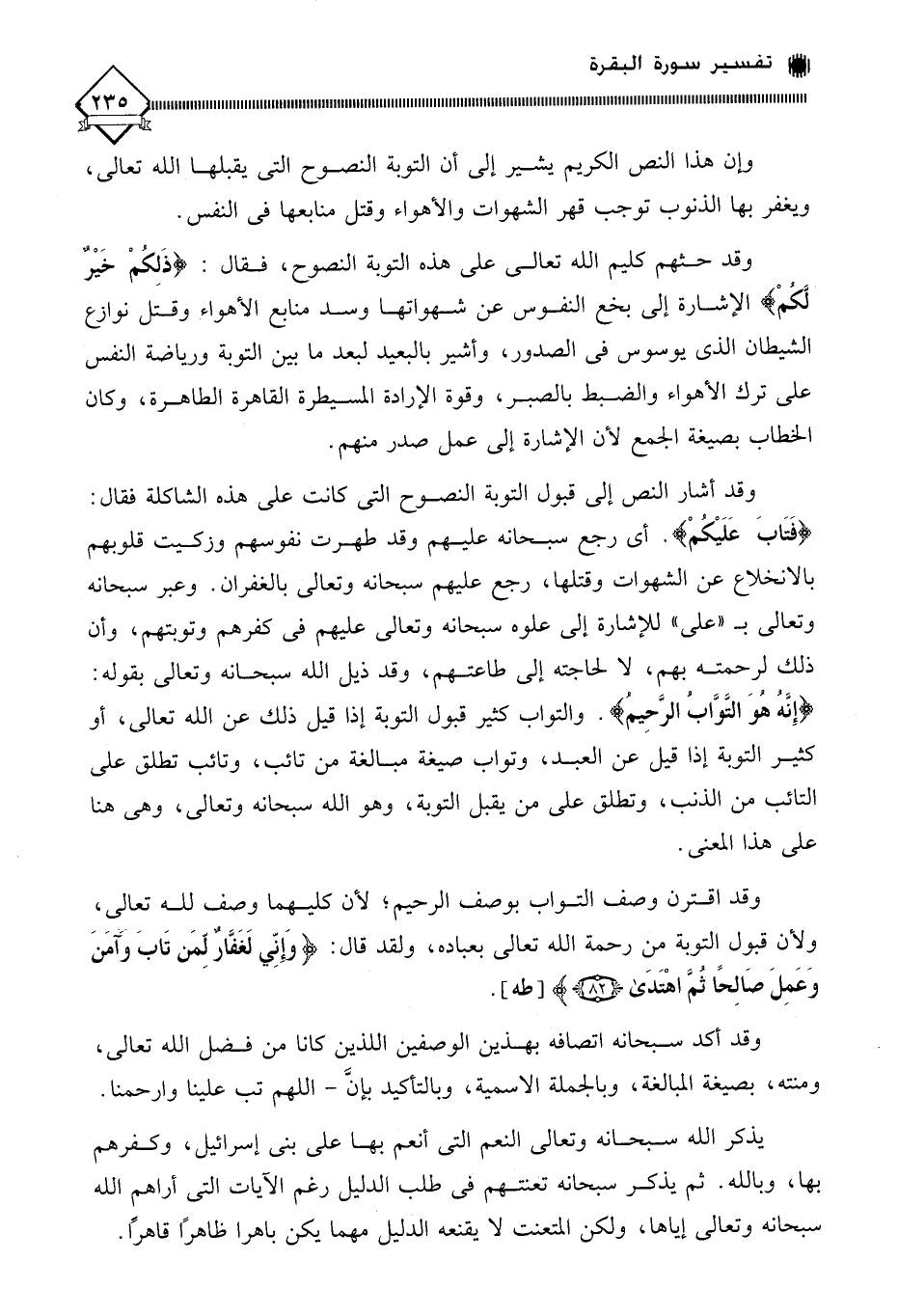 وقد أشار النص إلى قبول التوبة النصوح التي كانت على هذه الشاكلة فقال: (فَتَابَ عَلَيْكُمْ). أي رجع سبحانه عليهم وقد طهرت نفوسهم وزكيت قلوبهم بالانخلاع عن الشهوات وقتلها، رجع عليهم سبحانه وتعالى بالغفران. وعبر سبحانه وتعالى بـ " على " للإشارة إلى علوه سبحانه وتعالى عليهم في كفرهم وتوبتهم، وأن ذلك لرحمته بهم، لَا لحاجته إلى طاعتهم، وقد ذيل الله سبحانه وتعالى بقوله: (إِنَّهُ هُوَ التَّوَّابُ الرَّحِيم). والتواب كثير قبول التوبة إذا قيل ذلك عن الله تعالى، أو كثير التوبة إذا قيل عن العبد، وتواب صيغة مبالغة من تائب، وتائب تطلق على التائب من الذنب، وتطلق على من يقبل التوبة، وهو الله سبحانه وتعالى، وهي هنا على هذا المعنى.