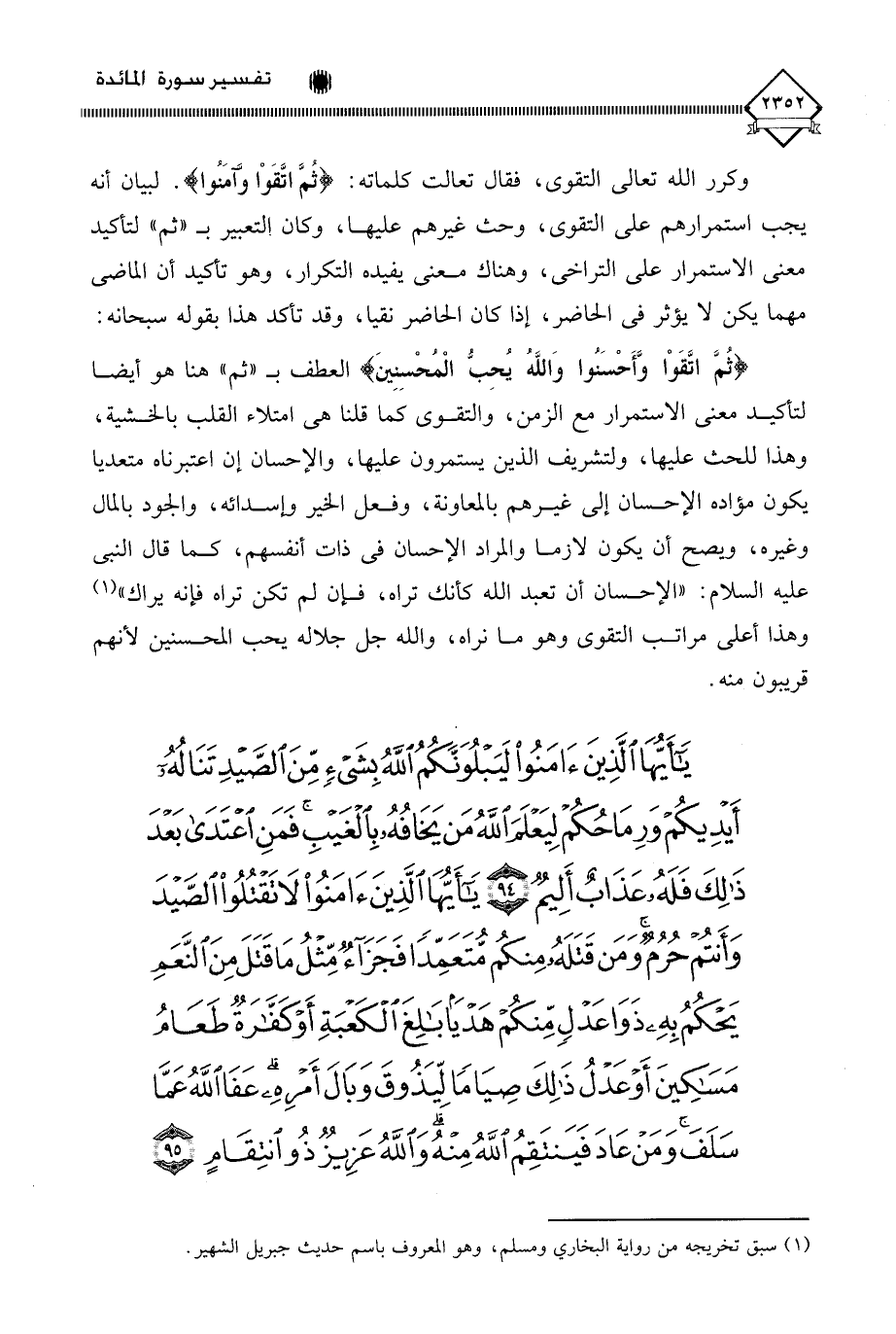 (ثُمَّ اتَّقَوْا وَّأَحْسَنُوا وَاللَّهُ يُحِبُّ الْمُحْسِنِينَ) العطف بـ " ثم " هنا هو أيضا لتأكيد معنى الاستمرار مع الزمن، والتقوى كما قلنا هي امتلاء القلب بالخشية، وهذا للحث عليها، ولتشريف الذين يستمرون عليها، والإحسان إن اعتبرناه متعديا يكون مؤاده الإحسان إلى غيرهم بالمعاونة، وفعل الخير وإسدائه، والجود بالمال وغيره، ويصح أن يكون لازما والمراد الإحسان في ذات أنفسهم، كما قال النبي عليه السلام: " الإحسان أن تعبد الله كأنك تراه، فإن لم تكن تراه فإنه يراك " (¬1) وهذا أعلى مراتب التقوى وهو ما نراه، والله جل جلاله يحب المحسنين لأنهم قريبون منه.
