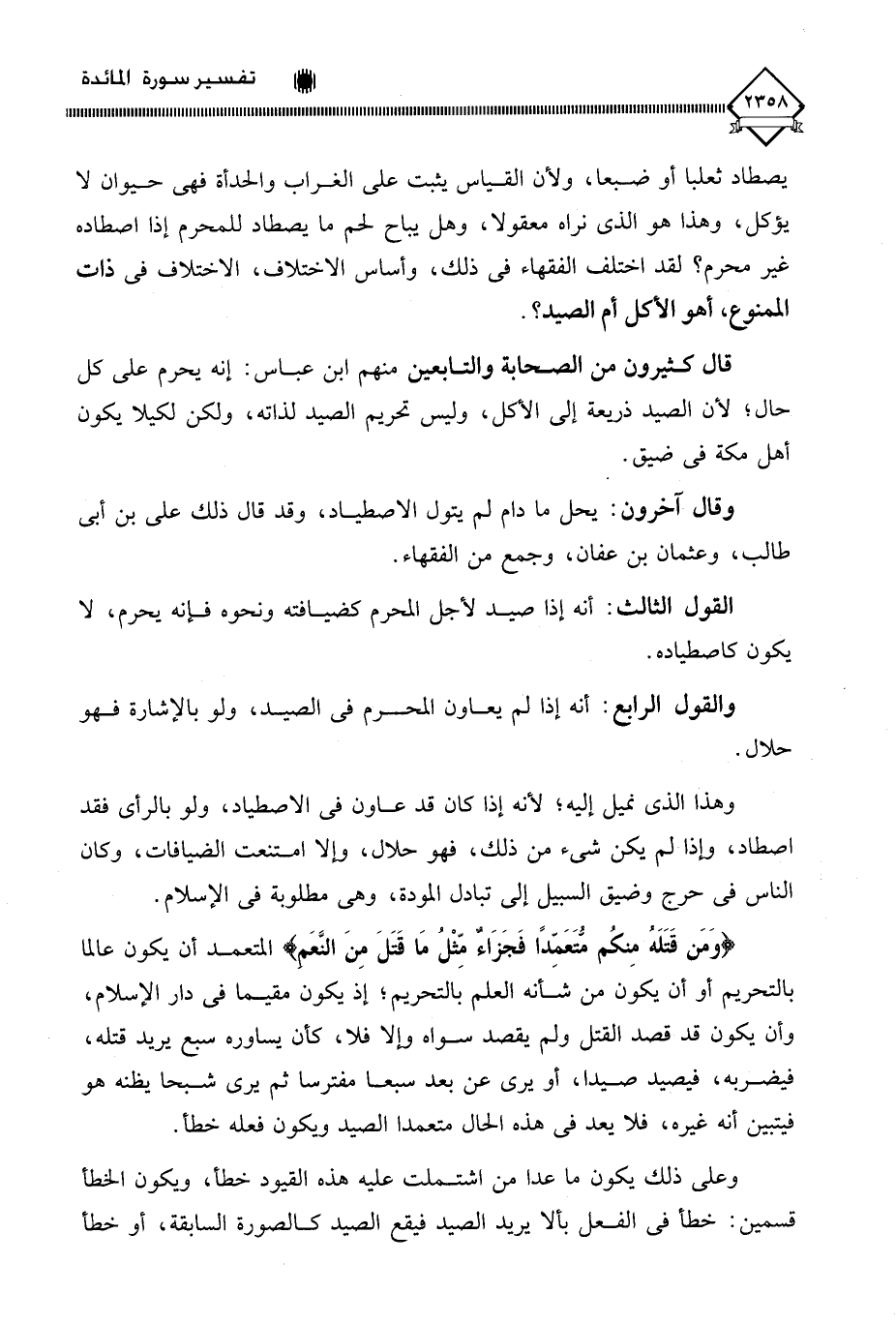 يصطاد ثعلبا أو ضبعا، ولأن القياس يثبت على الغراب والحدأة فهي حيوان لا يؤكل، وهذا هو الذي نراه معقولا، وهل يباح لحم ما يصطاد للمحرم إذا اصطاده غير محرم؟ لقد اختلف الفقهاء في ذلك، وأساس الاختلاف، الاختلاف في ذات الممنوع، أهو الأكل أم الصيد؟.