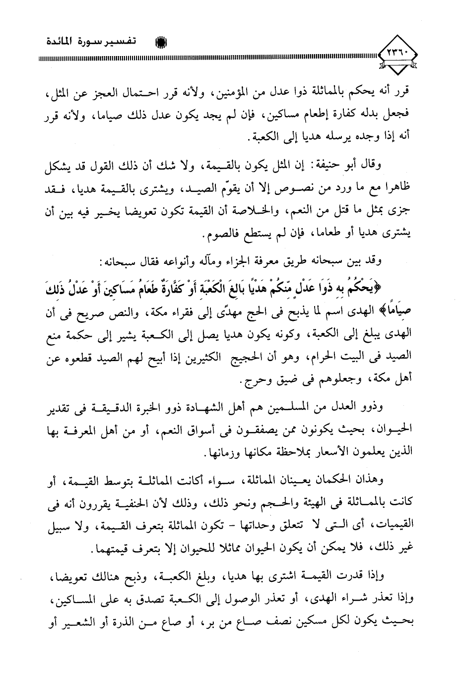 (يَحْكُمُ بِهِ ذَوَا عَدْلٍ مِّنكُمْ هَدْيًا بَالِغَ الْكَعْبَةِ أَوْ كفَّارَةٌ طَعَامُ مَسَاكِينَ أَوْ عَدْلُ ذَلِكَ صِيَامًا) الهدى اسم لما يذبح في الحج مهدًى إلى فقراء مكة، والنص صريح في أن الهدْي يبلغ إلى الكعبة، وكونه يكون هديا يصل إلى الكعبة يشير إلى حكمة منع الصيد في البيت الحرام، وهو أن الحجيج الكثيرين إذا أبيح لهم الصيد قطعوه عن أهل مكة، وجعلوهم في ضيق وحرج.