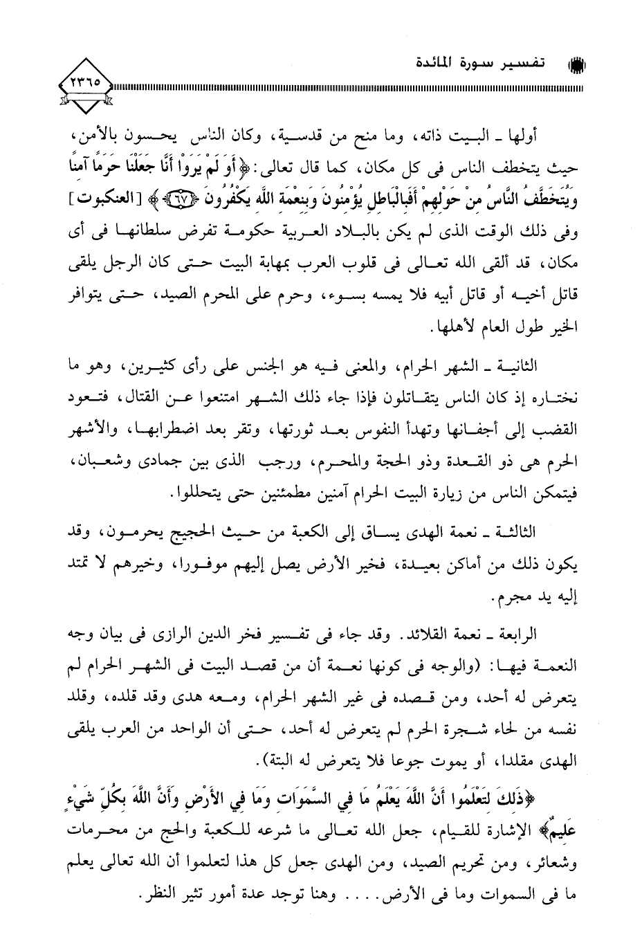 الرابعة - نعمة القلائد. وقد جاء في تفسير فخر الدين الرازي في بيان وجه النعمة فيها: (والوجه في كونها نعمة أن من قصد البيت في الشهر الحرام لم يتعرض له أحد، ومن قصده في غير الشهر الحرام، ومعه هدْي وقد قلَّده، وقلَّد نفسه من لحاء شجرة الحرم لم يتعرض له أحد، حتى أن الواحد من العرب يلقى الهدْي مقلدا، أو يموت جوعا فلا يتعرض له ألبتة).