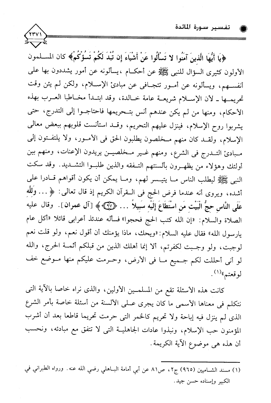 (يَا أَيُّهَا الَّذِينَ آمَنُوا لَا تَسْألُوا عَنْ أَشْيَاءَ إِن تُبْدَ لَكُمْ تَسؤْكُمْ) كان المسلمون الأولون كثيري السؤال للنبي - صلى الله عليه وسلم - عن أحكام، يسألونه عن أمور يشددون بها على أنفسهم، ويسألونه عن أمور تتجافى عن مبادئ الإسلام، ولكن لم يئن وقت تحريمها - لأن الإسلام شريعة عامة خالدة، وقد ابتدأ مخاطبا العرب بهذه الأحكام، ومنها من لم يكن عندهم أنس بتحريمها فاحتاجوا إلى التدرج، حتى يشربوا روح الإسلام، فينزل عليهم التحريم، وقد استأنست قلوبهم ببعض معالي الإسلام، ولقد كان منهم مخلصون يطلبون الحق في الأمور، ولا يلتفتون إلى مبادئ التدرج في الشرع، ومنهم غير مخلصين يريدون الإعنات، ومنهم بين أولئك وهؤلاء من يظهرون بألسنتهم التفقه والذين طلبوا التشديد. وقد سكت النبي - صلى الله عليه وسلم - ليطلب الناس ما يتيسر لهم، وما يمكن أن يكون أقواهم قادرا على أشده، ويروى أنه عندما فرض الحج في القرآن الكريم إذ قال تعالى: (. . . وَلِلَّهِ عَلَى النَّاسِ حِجُّ الْبَيْتِ مَنِ اسْتَطَاعَ إِلَيْهِ سَبِيلًا. . .). وقال عليه الصلاة والسلام: " إن الله كتب الحج فحجوا " فسأله عندئذ أعرابي قائلا " أكل عام يا رسول الله " فقال عليه السلام: " ويحك، ماذا يؤمنك أن أقول نعم، ولو قلت نعم لوجبت، ولو وجبت لكفرتم، ألا إنما أهلك الذين من قبلكم أثمة الحرج، والله لو أنِّي أحللت لكم جميع ما في الأرض، وحرمت عليكم منها موضع خف لوقعتم " (¬1).