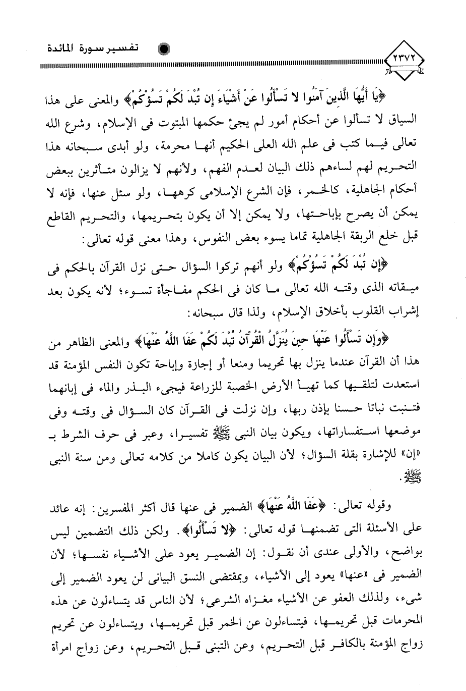 وقوله تعالى: (عَفَا اللَّهُ عَنْهَا) الضمير في عنها قال أكثر المفسرين: إنه عائد على الأسئلة التي تضمنها قوله تعالى: (لا تَسْألُوا). ولكن ذلك التضمين ليس بواضح، والأولى عندي أن نقول: إن الضمير يعود على الأشياء نفسها، لأن الضمير في " عنها " يعود إلى الأشياء، وبمقتضى النسق البياني لن يعود الضمير إلى شيء، ولذلك العفو عن الأشياء مغزاه الشرعي؛ لأن الناس قد يتساءلون عن هذه المحرمات قبل تحريمها، فيتساءلون عن الخمر قبل تحريمها، ويتساءلون عن تحريم زواج المؤمنة بالكافر قبل التحريم، وعن التبني قبل التحريم، وعن زواج امرأة