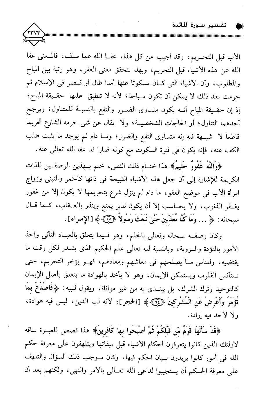 الأب قبل التحريم، وقد أجيب عن كل هذا، عفا الله عما سلف، فالمعنى عفا الله عن هذه الأشياء قبل التحريم، وبهذا يتحقق معنى العفو، وهو رتبة بين المباح والمطلوب، وأن الأشياء التي كان مسكوتا عنها أمدا طال أو قصر في الإسلام ثم حرمت بعد ذلك لَا يمكن أن تكون مباحة، لأنه لَا تنطبق عليها حقيقة المباح " إذ إن حقيقة المباح أنه يكون متساوي الضرر والنفع بالنسبة للمتناول، ويرجح أحدهما التناول، أو الحاجات الشخصية، ولا يقال عن شيء حرمه الشارع تحريما قاطعا لَا شبهة فيه إنه متساوي النفع والضرر، وما دام لم يوجد ما يثبت طلب الكف عنه، فإنه يكون في فترة السكوت مع كونه ضارا قد عفا الله تعالى عنه.