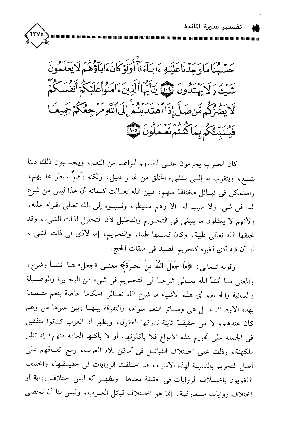 حَسْبُنَا مَا وَجَدْنَا عَلَيْهِ آبَاءَنَا أَوَلَوْ كَانَ آبَاؤُهُمْ لَا يَعْلَمُونَ شَيْئًا وَلَا يَهْتَدُونَ (104) يَا أَيُّهَا الَّذِينَ آمَنُوا عَلَيْكُمْ أَنْفُسَكُمْ لَا يَضُرُّكُمْ مَنْ ضَلَّ إِذَا اهْتَدَيْتُمْ إِلَى اللَّهِ مَرْجِعُكُمْ جَمِيعًا فَيُنَبِّئُكُمْ بِمَا كُنْتُمْ تَعْمَلُونَ (105)