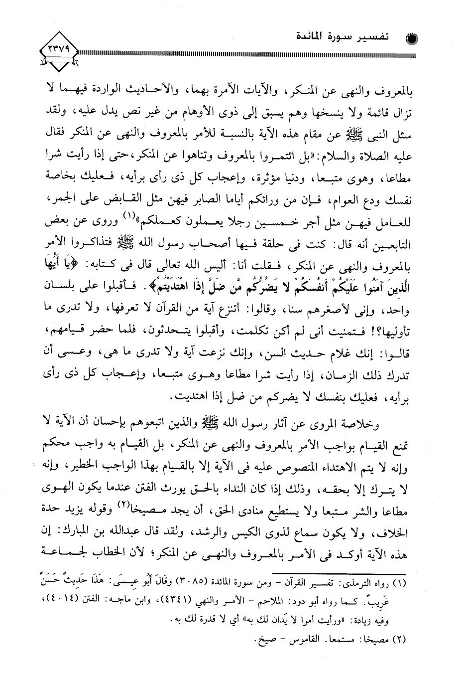 بالمعروف والنهي عن المنكر، والآيات الآمرة بهما، والأحاديث الواردة فيهما لا تزال قائمة ولا ينسخها وهم يسبق إلى ذوي الأوهام من غير نص يدل عليه، ولقد سئل النبي - صلى الله عليه وسلم - عن مقام هذه الآية بالنسبة للأمر بالمعروف والنهي عن المنكر فقال عليه الصلاة والسلام: " بل ائتمروا بالمعروف وتناهوا عن المنكر، حتى إذا رأيت شرا مطاعا، وهوى متبعا، ودنيا مؤثرة، وإعجاب كل ذي رأى برأيه، فعليك بخاصة نفسك ودع العوام، فإن من ورائكم أياما الصابر فيهن مثل القابض على الجمر، للعامل فيهن مثل أجر خمسين رجلا يعملون كعملكم " (¬1) وروي عن بعض التابعين أنه قال: كنت في حلقة فيها أصحاب رسول الله - صلى الله عليه وسلم - فتذاكروا الأمر بالمعروف والنهي عن المنكر، فقلت أنا: أليس الله تعالى قال في كتابه: (يَا أَيُّهَا الَّذِينَ آمَنُوا عَلَيْكُمْ أَنفُسَكُمْ لَا يَضُرُّكُم مَّن ضَلَّ إِذَا اهْتَدَيْتُم). فأقبلوا على بلسان واحد، وإني لأصغرهم سنا، وقالوا: أتنزع آية من القرآن لَا تعرفها، ولا تدري ما تأوليها؟! فتمنيت أني لم أكن تكلمت، وأقبلوا يتحدثون، فلما حضر قيامهم، قالوا: إنك غلام حديث السن، وإنك نزعت آية ولا تدري ما هي، وعسى أن تدرك ذلك الزمان، إذا رأيت شرا مطاعا وهوى متبعا، وإعجاب كل ذي رأى برأيه، فعليك بنفسك لَا يضركم من ضل إذا اهتديت.