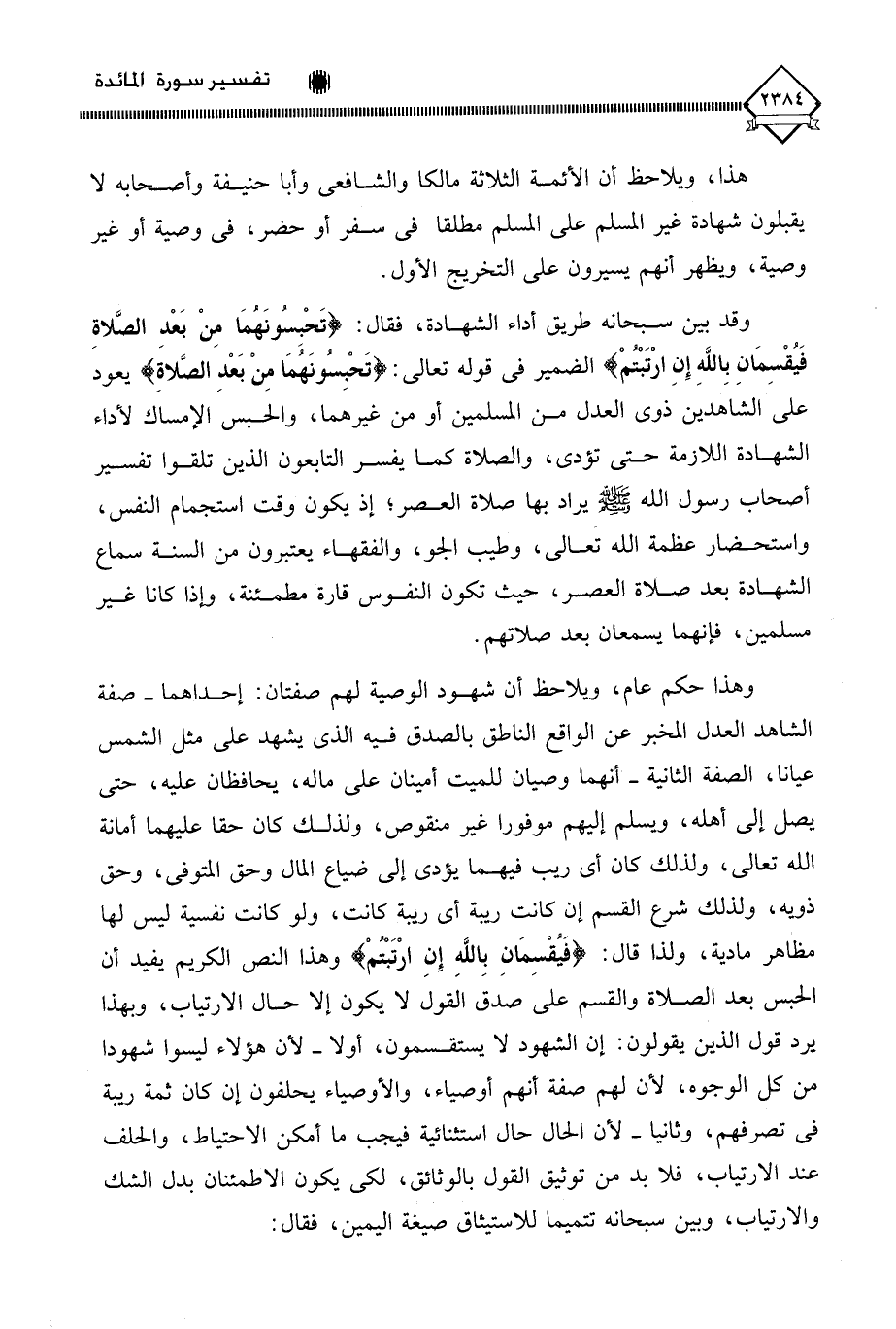 وهذا حكم عام، ويلاحظ أن شهود الوصية لهم صفتان: إحداهما - صفة الشاهد العدل المخبر عن الواقع الناطق بالصدق فيه الذي يشهد على مثل الشمس عيانا، الصفة الثانية - أنهما وصيان للميت أمينان على ماله، يحافظان عليه، حتى يصل إلى أهله، ويسلم إليهم موفورا غير منقوص، ولذلك كان حقا عليهما أمانة الله تعالى، ولذلك كان أي ريب فيهما يؤدي إلى ضياع المال وحق المتوفى، وحق ذويه، ولذلك شرع القسم إن كانت ريبة أي ريبة كانت، ولو كانت نفسية ليس لها مظاهر مادية، ولذا قال: (فَيُقْسِمَانِ بِاللَّهِ إِنِ ارْتَبْتمْ) وهذا النص الكريم يفيد أن الحبس بعد الصلاة والقسم على صدق القول لَا يكون إلا حال الارتياب، وبهذا يرد قول الذين يقولون: إن الشهود لَا يستقسمون، أولا - لأن هؤلاء ليسوا شهودا من كل الوجوه، لأن لهم صفة أنهم أوصياء، والأوصياء يحلفون إن كان ثمة ريبة في تصرفهم، وثانيا - لأن الحال حال استثنائية فيجب ما أمكن الاحتياط، والحلف عند الارتياب، فلا بد من توثيق القول بالوثائق، لكي يكون الاطمئنان بدل الشك والارتياب، وبين سبحانه تتميما للاستيثاق صيغة اليمين، فقال: