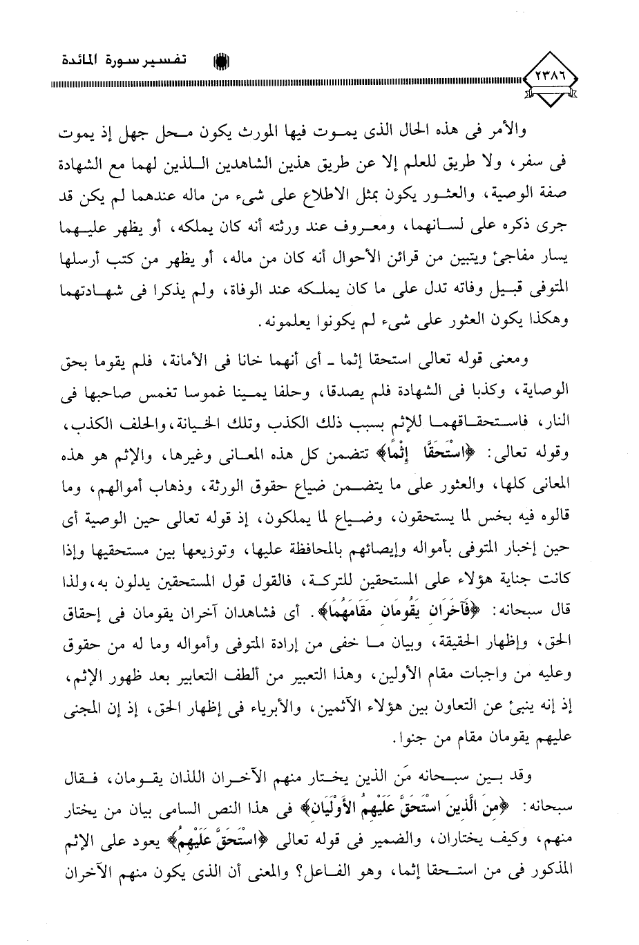 ومعنى قوله تعالى استحقا إثما - أي أنهما خانا في الأمانة، فلم يقوما بحق الوصاية، وكذبا في الشهادة فلم يصدقا، وحلفا يمينا غموسا تغمس صاحبها في النار، فاستحقاقهما للإثمِ بسبب ذلك الكذب وتلك الخيانة، والحلف الكذب، وقوله تعالى: (اسْتَحَقَّا إِثْمًا) تتضمن كل هذه المعاني وغيرها، والإثم هو هذه المعاني كلها، والعثور على ما يتضمن ضياع حقوق الورثة، وذهاب أموالهم، وما قالوه فيه بخس لما يستحقون، وضياع لما يملكون، إذ قوله تعالى حين الوصية أي حين إخبار المتوفى بأمواله وإيصائهم بالمحافظة عليها، وتوزيعها بين مستحقيها وإذا كانت جناية هؤلاء على المستحقين للتركة، فالقول قول المستحقين يدلون به، ولذا قال سبحانه: (فَآخَرَانِ يَقُومَانِ مَقَامَهُمَا). أي فشاهدان آخران يقومان في إحقاق الحق، وإظهار الحقيقة، وبيان ما خفي من إرادة المتوفى وأمواله وما له من حقوق وعليه من واجبات مقام الأولين، وهذا التعبير من ألطف التعابير بعد ظهور الإثم، إذ إنه ينبئ عن التعاون بين هؤلاء الآثمين، والأبرياء في إظهار الحق، إذ إن المجني عليهم يقومان مقام من جنوا.