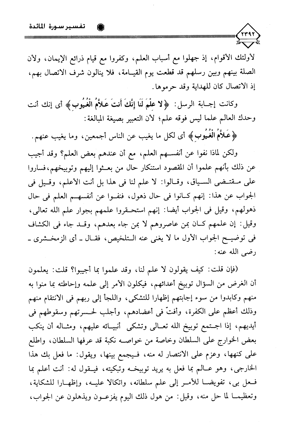(فإن قلت: كيف يقولون لَا علم لنا، وقد علموا بما أجيبوا؟ قلت: يعلمون أن الغرض من السؤال توبيخ أعدائهم، فيكلون الأمر إلى علمه وإحاطته بما منوا به منهم وكابدوا من سوء إجابتهم إظهارا للتشكي، واللجأ إلى ربهم في الانتقام منهم وذلك أعظم على الكفرة، وأفتّ في أعضادهم، وأجلب لحسرتهم وسقوطهم في أيديهم، إذا اجتمع توبيخ الله تعالى وتشكي أنبيائه عليهم، ومثاله أن ينكب بعض الخوارج على السلطان وخاصة من خواصه نكبة قد عرفها السلطان، واطلع على كنهها، وعزم على الانتصار له منه، فيجمع بينها، ويقول: ما فعل بك هذا الخارجي، وهو عالم بما فعل به يريد توبيخه وتبكيته، فيقول له: أنت أعلم بما فعل بي، تفويضا للأمر إلى علم سلطانه، واتكالا عليه، وإظهارا للشكاية، وتعظيما لما حل منه، وقيل: من هول ذلك اليوم يفزعون ويذهلون عن الجواب،