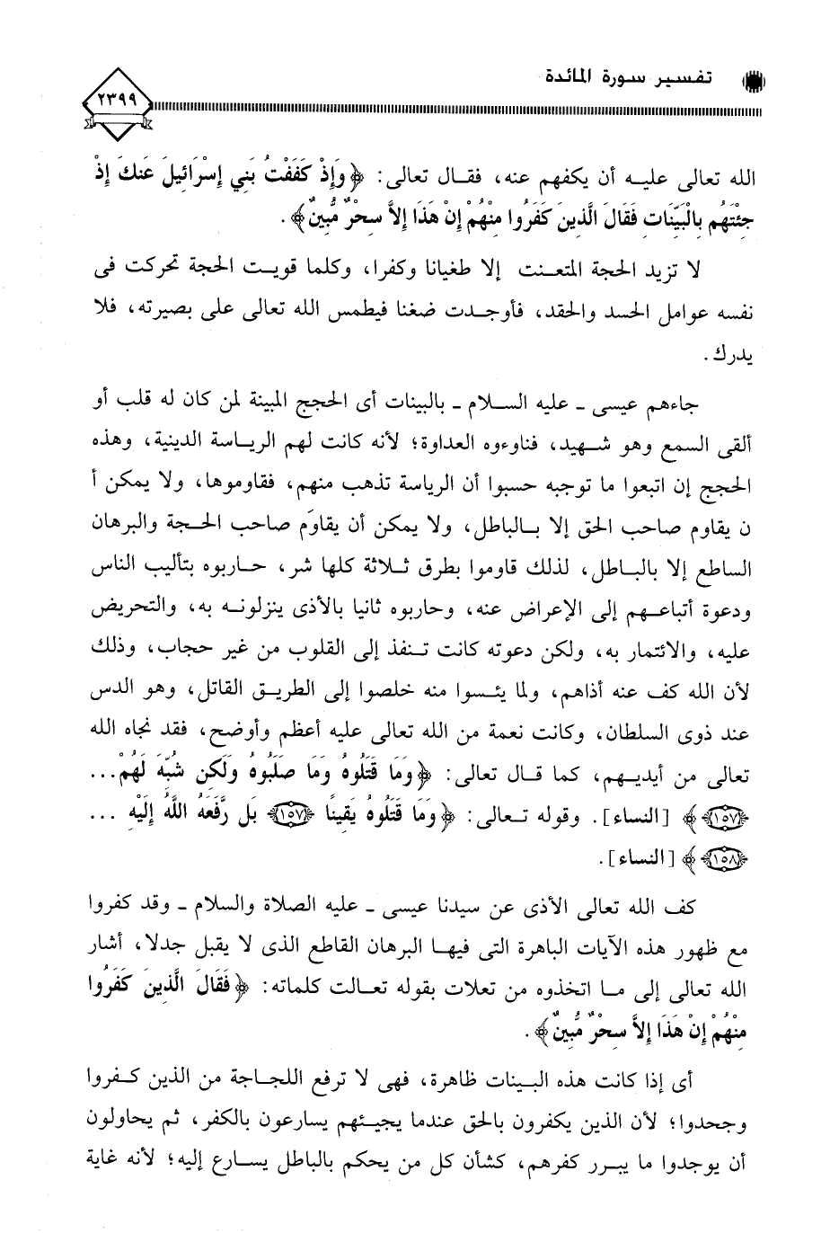 الله تعالى عليه أن يكفهم عنه، فقال تعالى: (وَإِذْ كَفَفْتُ بَنِي إِسْرَائِيلَ عَنْكَ إِذْ جِئْتَهُمْ بِالْبَيِّنَاتِ فَقَالَ الَّذِينَ كَفَرُوا مِنْهُمْ إِنْ هَذَا إِلَّا سِحْرٌ مُبِينٌ). لا تزيد الحجة المتعنت إلا طغيانا وكفرا، وكلما قويت الحجة تحركت في نفسه عوامل الحسد والحقد، فأوجدت ضغنا فيطمس الله تعالى على بصيرته، فلا يدرك.