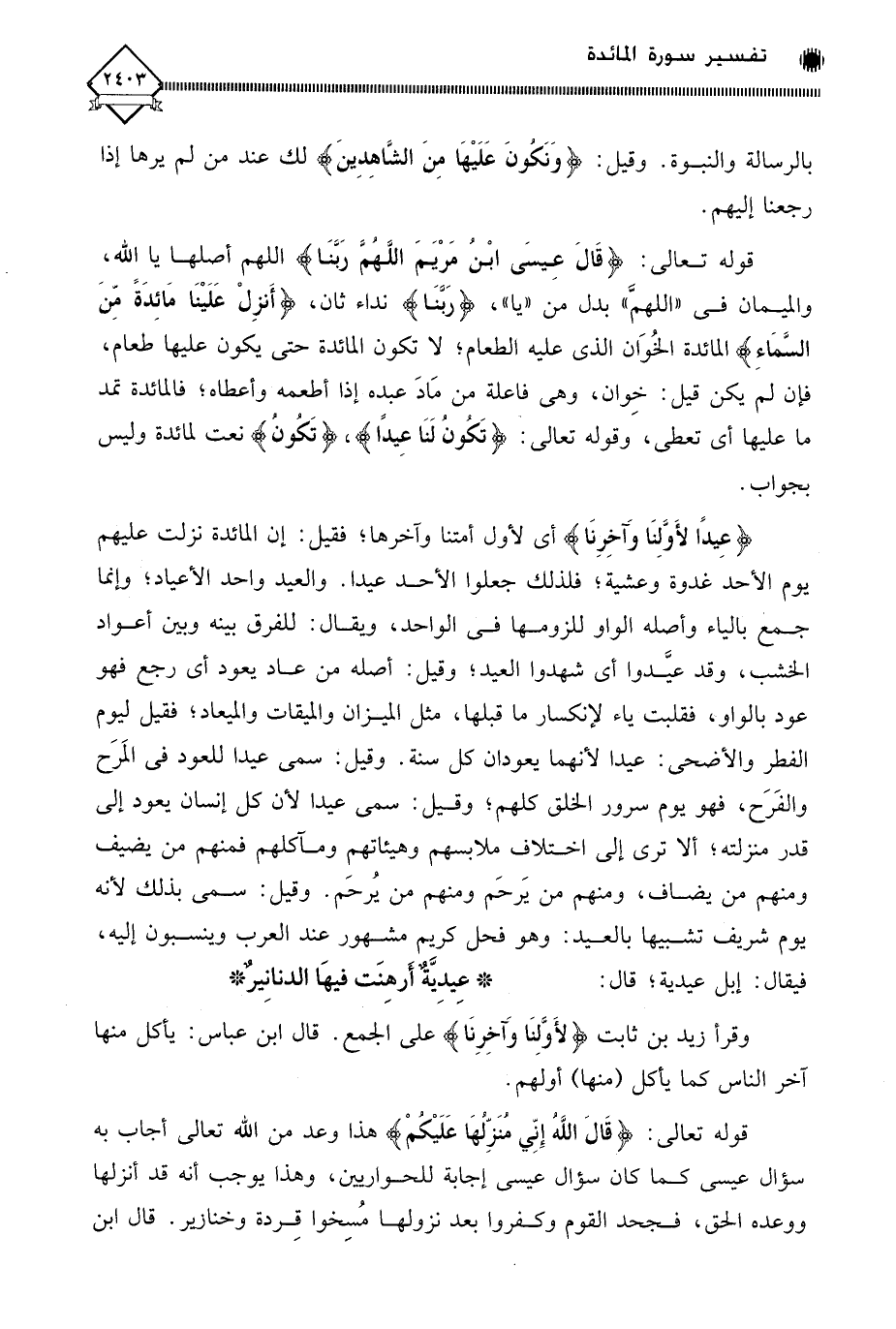اللهم أصلها يا الله، والميمان في " اللهمَّ " بدل من " يا "، (رَبَّنَا) نداء ثان، (أَنزِلْ عَلَيْنَا مَائِدَةً مِّنَ السَّمَاءِ) المائدة الخُوَان الذي عليه الطعام، لَا تكون المائدة حتى يكون عليها طعام، فإن لم يكن قيل: خِوان، وهي فاعلة من مَادَ عبده إذا أطعمه وأعطاه؛ فالمائدة تمد ما عليها أي تعطى، وقوله تعالى: (تَكُونُ لَنَا عِيدًا)، (تَكُونُ) نعت لمائدة وليس بجواب.