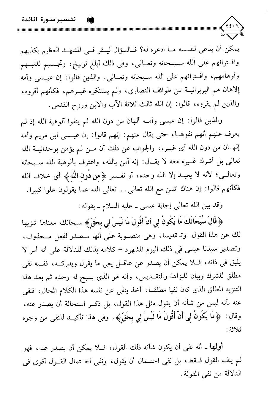 (قَالَ سُبْحَانَكَ مَا يَكُونُ لِي أَنْ أَقُولَ مَا لَيْسَ لِي بِحَقٍّ) س بحانك معناها تنزيها لك عن هذا القول وتقديسا، وهي منصوبة على أنها مصدر لفعل محذوف، وتصدير سيدنا عيسى في ذلك اليوم المشهود - كلامه بذلك للدلالة على أنه أمر لا يليق في ذاته، فلا يمكن أن يصدر عن عاقل يعي ما يقول ويدركه، ففيه نفي مطلق للشرك وبيان للنزاهة والتقديس، وأنه هو الذي يسبح له وحده ثم بعد هذا التنزيه المطلق الذي كان نفيا مطلقا، أخذ ينفي عن نفسه هذا الكلام المحال، فنفي عنه بأنه ليس من شأنه أن يقول مثل هذا القول، بل ذكر استحالة أن يصدر عنه، وقال: (مَا يَكُونُ لِي أَنْ أَقُولَ مَا لَيْسَ لِي بِحَقٍّ). وفي هذا تأكيد للنفي من وجوه ثلاثة: