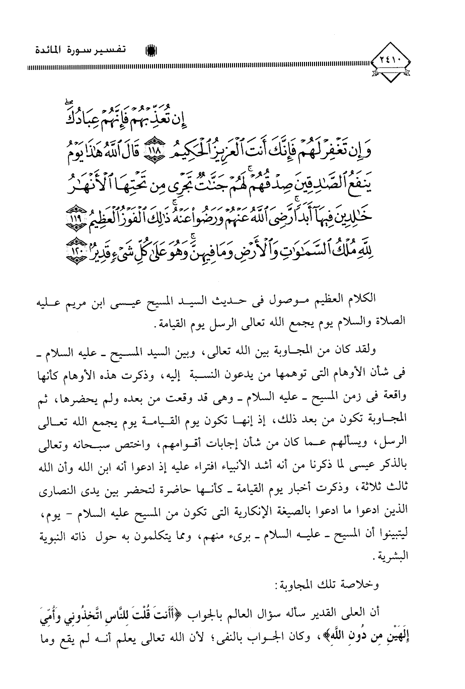(إِنْ تُعَذِّبْهُمْ فَإِنَّهُمْ عِبَادُكَ وَإِنْ تَغْفِرْ لَهُمْ فَإِنَّكَ أَنْتَ الْعَزِيزُ الْحَكِيمُ (118) قَالَ اللَّهُ هَذَا يَوْمُ يَنْفَعُ الصَّادِقِينَ صِدْقُهُمْ لَهُمْ جَنَّاتٌ تَجْرِي مِنْ تَحْتِهَا الْأَنْهَارُ خَالِدِينَ فِيهَا أَبَدًا رَضِيَ اللَّهُ عَنْهُمْ وَرَضُوا عَنْهُ ذَلِكَ الْفَوْزُ الْعَظِيمُ (119) لِلَّهِ مُلْكُ السَّمَاوَاتِ وَالْأَرْضِ وَمَا فِيهِنَّ وَهُوَ عَلَى كُلِّ شَيْءٍ قَدِيرٌ (120)