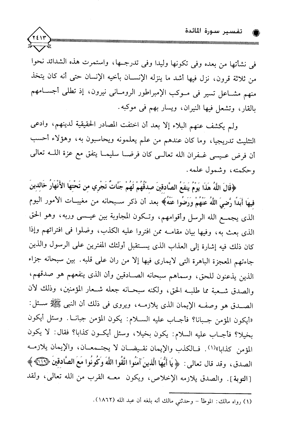 (قَالَ اللَّهُ هَذَا يَوْمُ يَنْفَعُ الصَّادِقِينَ صِدْقُهُمْ لَهُمْ جَنَّاتٌ تَجْرِي مِنْ تَحْتِهَا الْأَنْهَارُ خَالِدِينَ فِيهَا أَبَدًا رَضِيَ اللَّهُ عَنْهُمْ وَرَضُوا عَنْهُ ... (119)