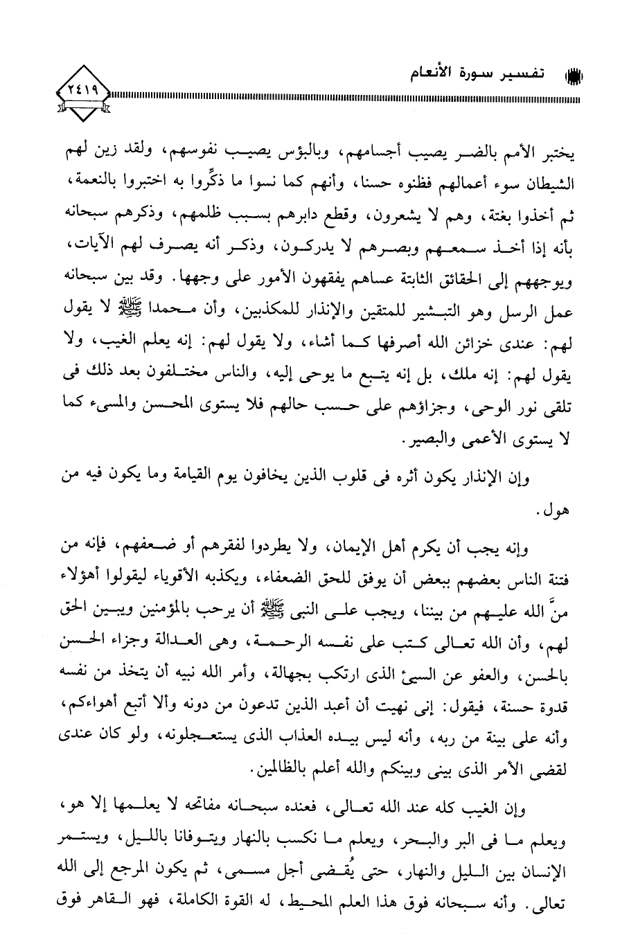 وإنه يجب أن يكرم أهل الإيمان، ولا يطردوا لفقرهم أو ضعفهم، فإنه من فتنة الناس بعضهم ببعض أن يوفق للحق الضعفاء، ويكذبه الأقوياء ليقولوا أهؤلاء منَّ الله عليهم من بيننا، ويجب على النبي - صلى الله عليه وسلم - أن يرحب بالمؤمنين ويبين الحق لهم، وأن الله تعالى كتب على نفسه الرحمة، وهي العدالة وجزاء الحسن بالحسن، والعفو عن السيئ الذي ارتكب بجهالة، وأمر الله نبيه أن يتخذ من نفسه قدوة حسنة، فيقول: إني نهيت أن أعبد الذين تدعون من دونه وألا أتبع أهواءكم، وأنه على بينة من ربه، وأنه ليس بيده العذاب الذي يستعجلونه، ولو كان عندي لقضى الأمر الذي بيني وبينكم والله أعلم بالظالمين.