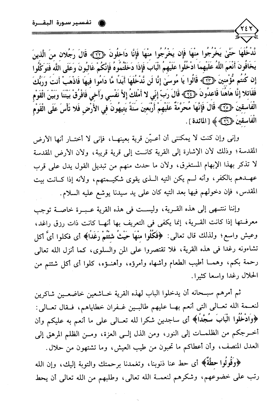 وإني وإن كنت لَا يمكنني أن أعيّن قرية بعينها، فإني لَا أختار أنها الأرض المقدسة، وذلك لأن الإشارة إلى القرية كانت إلى قرية قريبة، ولأن الأرض المقدسة لا تذكر بهذا الإبهام المستغرق، ولأن ما حدث منهم من تبديل القول يدل على قرب عهدهم بالكفر، وأنه لم يكن التيه الذي يقوى شكيمتهم، ولأنه إذا كانت بيت المقدس، فإن دخولهم فيها بعد التيه كان على يد سيدنا يوشع عليه السلام.